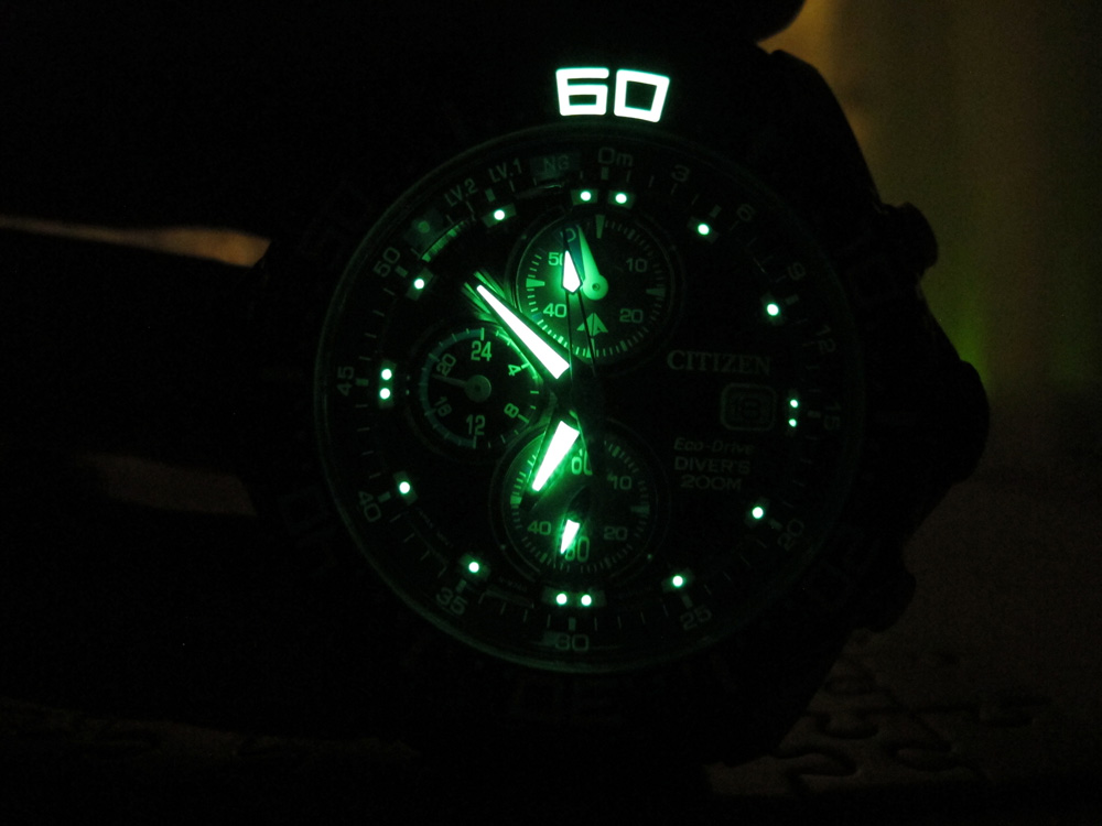 Бляха похожа на стилистику Panerai, прикольно! Очень лаконично сделана подсветка - на безеле светиться только цифра 60, точки 5-минутных делений на самом циферблате, три стрелки (+маленькая секундная), причем, дизайн продуман так, что перепутать стрелки сложно.
