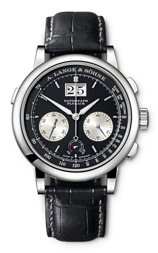 Классическая конструкция с управлением от колонного колеса, прецизионным минутным счетчиком мгновенного переключения и возвратной функцией flyback, собравшая все важнейшие ценности образцового хронографа, была воплощена в безупречном с точки зрения микромеханики и эстетической привлекательности механизме. Ценный механизм удачно дополнен циферблатом гармоничной компоновки: большой указатель даты Lange и два серебристых дополнительных циферблата маленькой секундной стрелки и минутного счетчика были размещены по вершинам равностороннего треугольника, при этом они контрастно выделялись на черном фоне циферблата, что обеспечивало великолепную четкость указателей.