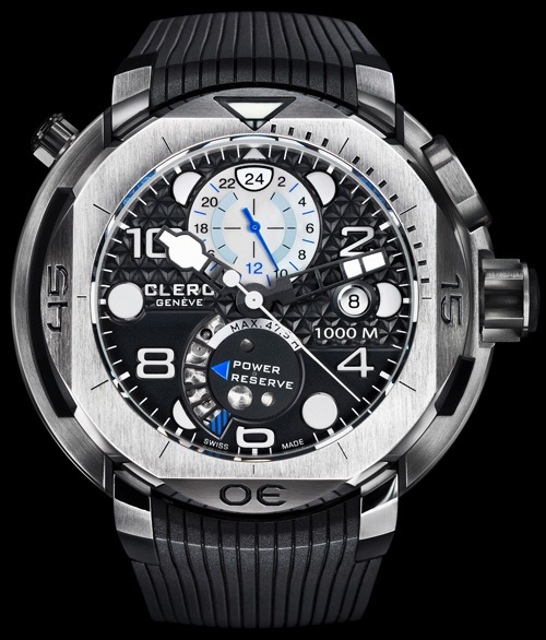 Знаменитая своими уникальными и сложными моделями, компания Clerc представила на международной часовой выставке GTE 2012 две новинки: дайверские часы Hydroscaph Central Chronograph и Hydroscaph Steel GMT.