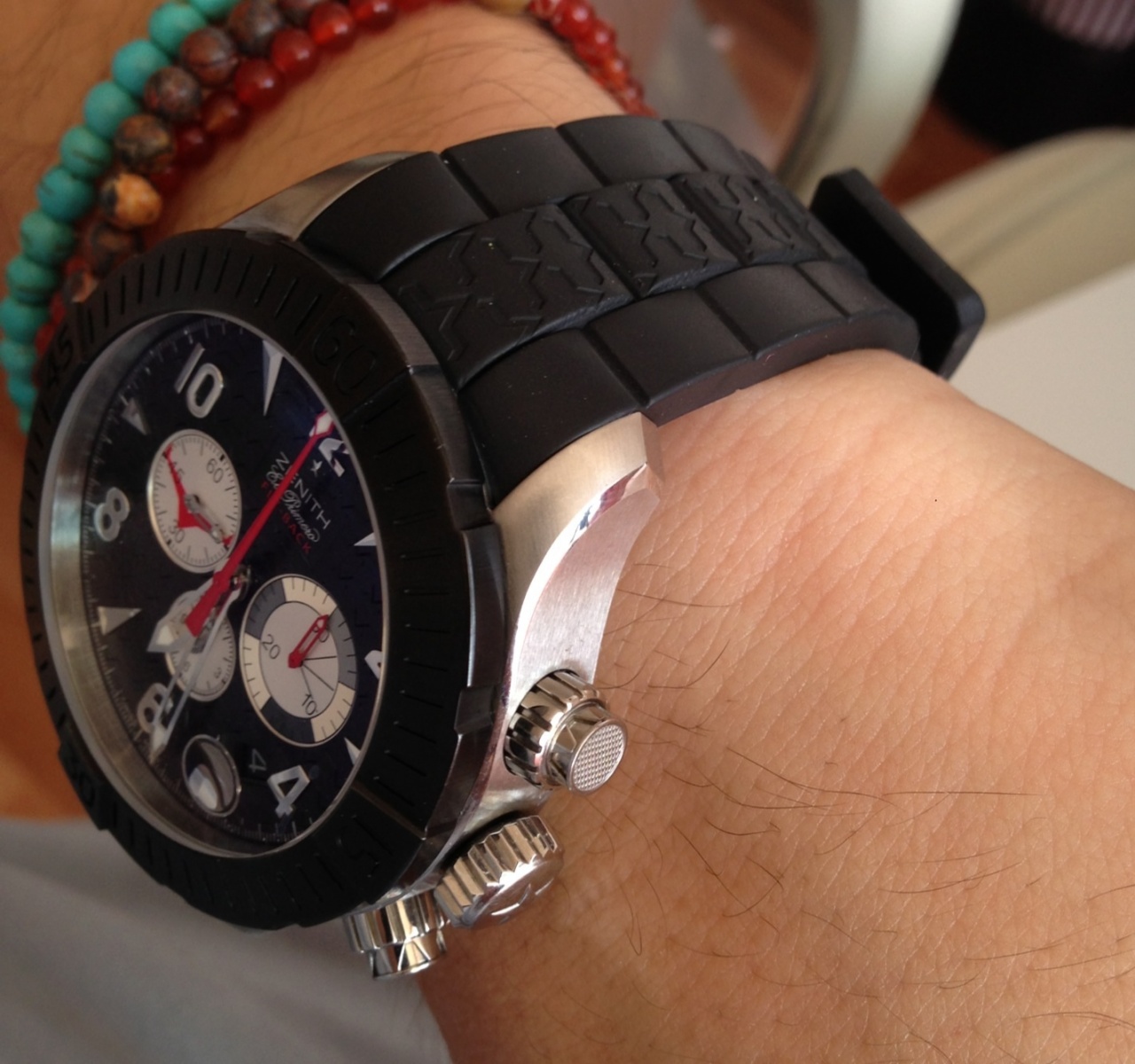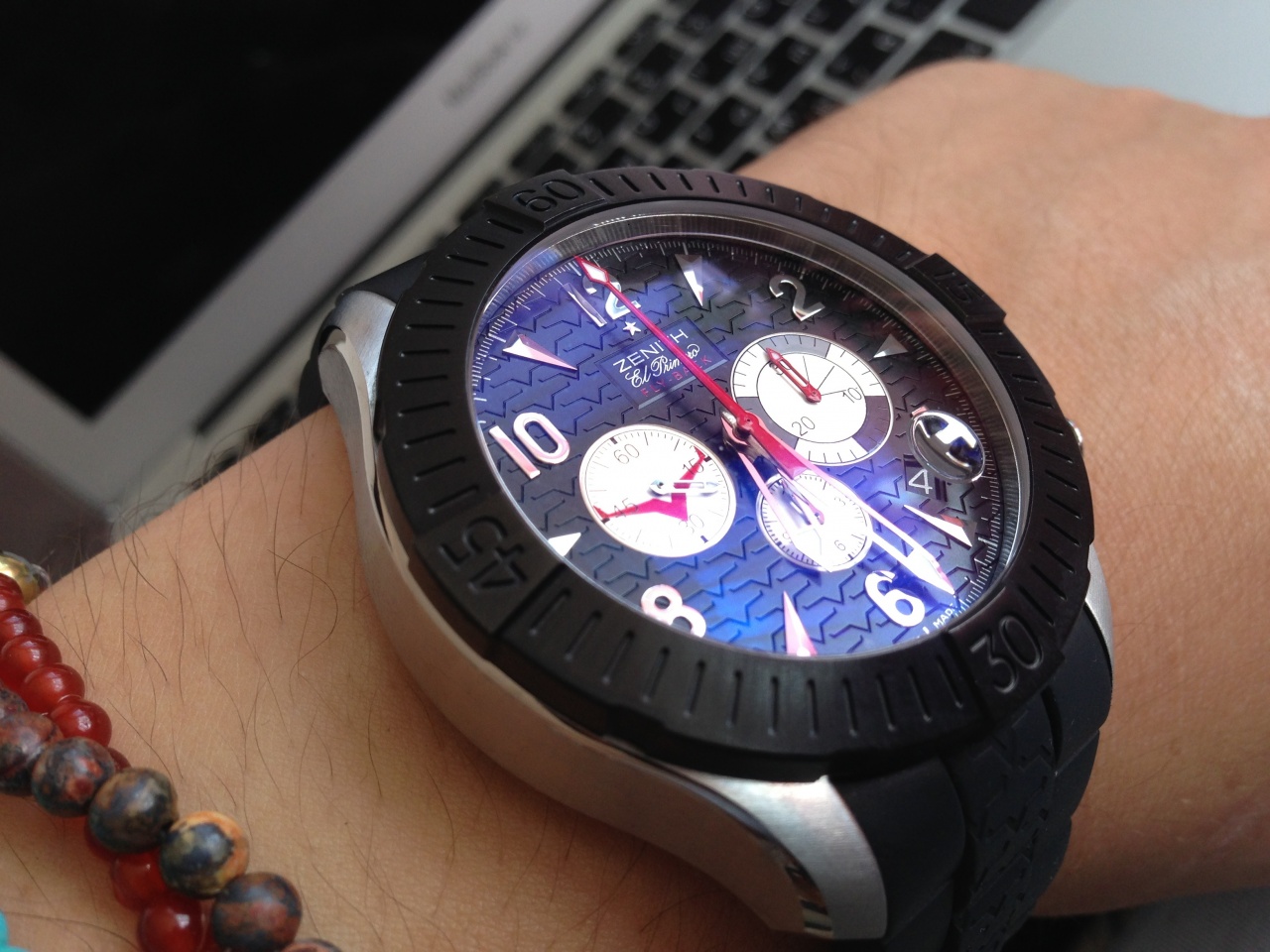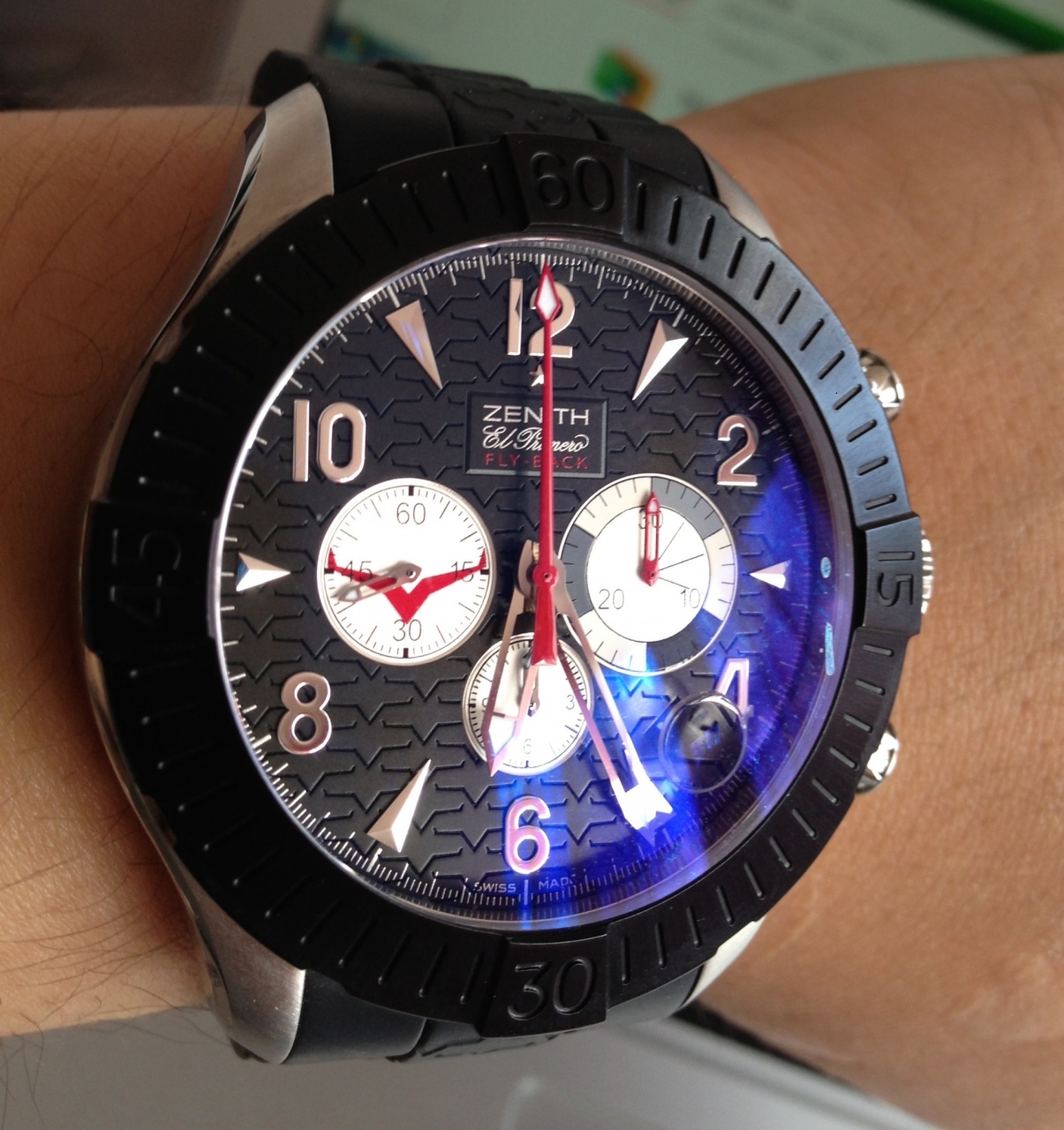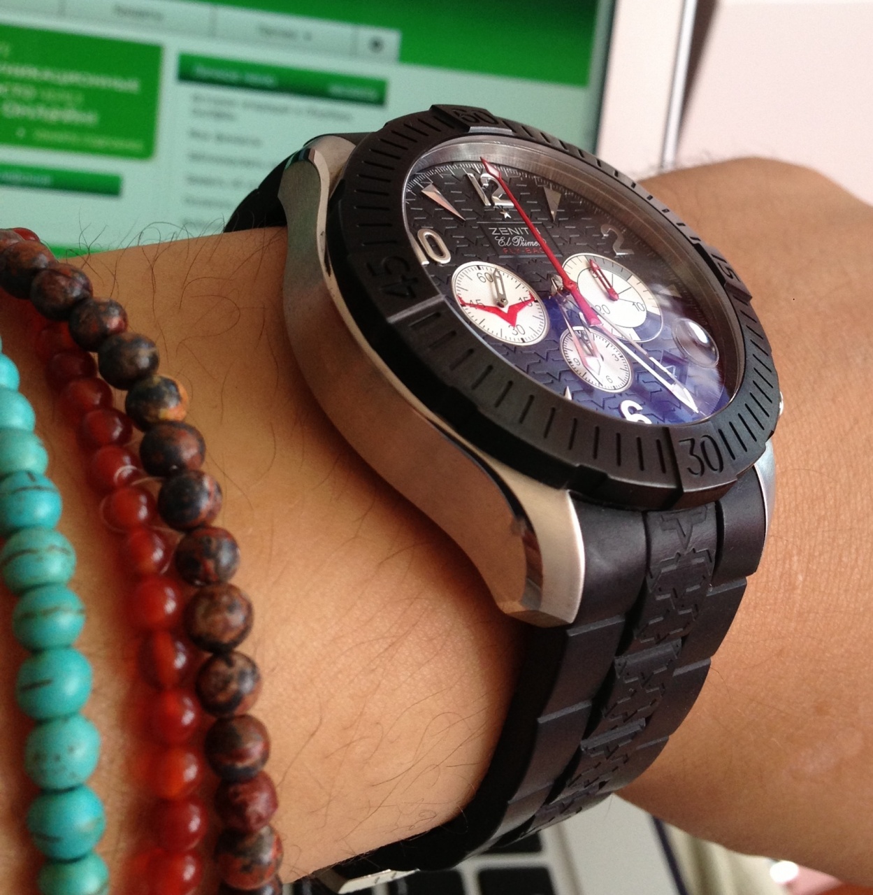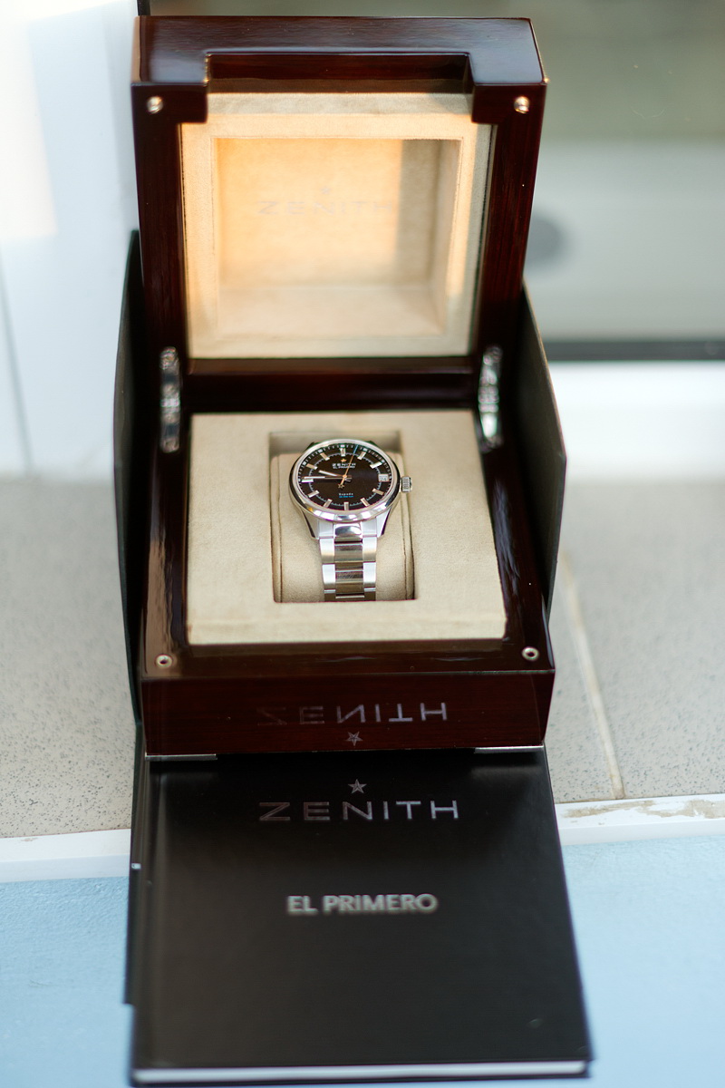 Вчера. В отличие от произведений Натафа, абсолютно не притягивает внимание людей, кто "не в теме", что мне чрезвычайно импонирует, да и немаловажно для моей работы (здравоохранение). Один пожилой продавец на примерке Longines в Чикаго, извинившись, попросил разрешения посмотреть поближе. Сказал, что это (Zenith), пожалуй, один из самых хорошо спрятанных секретов в индустрии. Мне кажется, я понял, что он хотел сказать.