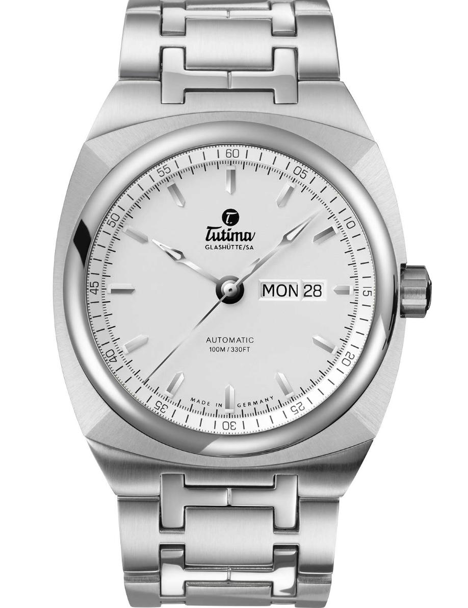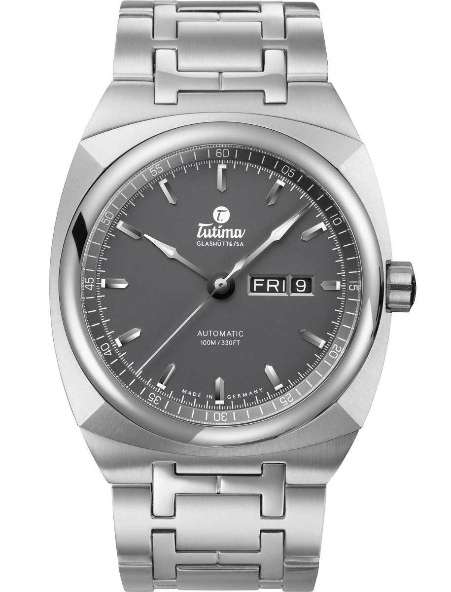 Модель оснащена швейцарским автоматическим механизмом Tutima 330, с функциями индикации часов, минут, секунд (посредством соответствующих центральных стрелок), дня недели и даты (посредством соответствующих буквенного и цифрового указателей в сдвоеннных апертурах, расположенных на 3 часах). Поставляется на браслете из нержавеющей стали с раскладной застежкой. Источник: http://forums.timezone.com/index.php...=0#msg_6533071 |