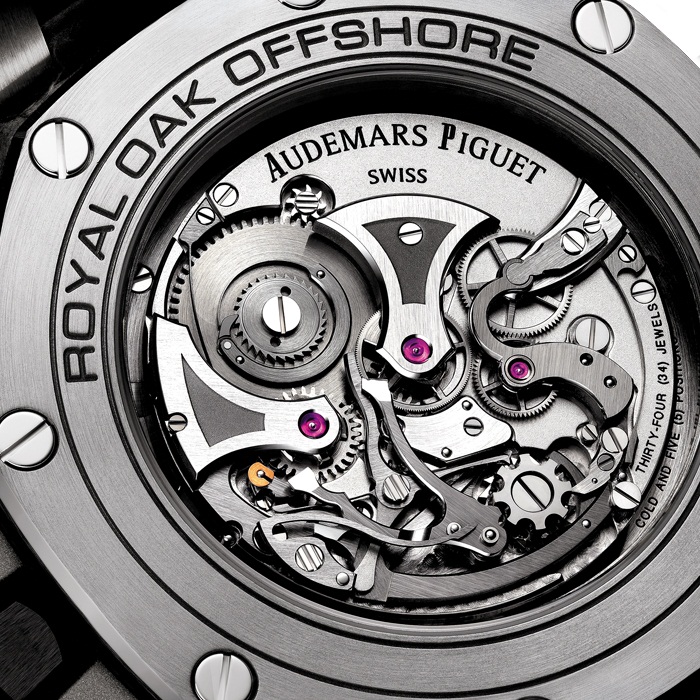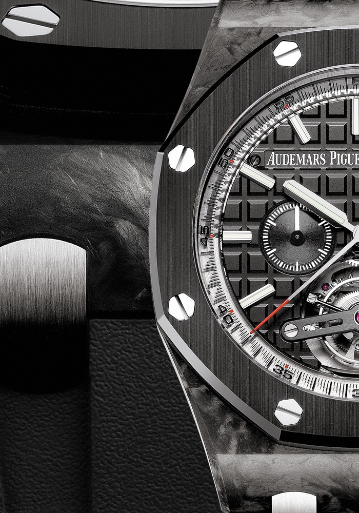 Авторы новинки с 42-мм корпусом стремились создать спортивные часы премиум-класса, которые были бы практически неуязвимы. Внутренняя оболочка из мягкого железа защищает механизм от воздействия магнитных полей; заводная головка и кнопки с каучуковым покрытием и видимая прокладка под завинчивающимся безелем гарантируют повышенную водонепроницаемость часов, а большое количество металла в корпусе обеспечивает механизму с автоподзаводом надежную защиту. Очень быстро модель Royal Oak Offshore получила статус культовой среди ценителей часового искусства и вошла в ряд самых значительных часовых произведений современности. Были выпущены их разнообразные версии, каждая из которых сохраняет подлинный характер исторической модели. Одна из самых удивительных таких версий – вышедшая в 2010 году первая модель ROO Tourbillon Chronograph с механизмом с ручным заводом и корпусом, в котором применены керамика и кованый карбон. Четыре года спустя Audemars Piguet представляет совершенно новый хронограф Royal Oak Offshore Tourbillon Chronograph. В нем используется только что вышедший автоматический калибр 2897, разработанный специально для этой модели. Калибр 2897, столь же великолепный, как и часы в целом, насчитывает 335 деталей. Этот шедевр микромеханики хорошо виден через заднюю крышку из сапфирового стекла. Примененные к его деталям операции по снятию фасок, полировке, скашиванию углов и декоративной отделке, полностью выполненные вручную, создают завораживающую игру света и тени. Не менее интересен калибр 2897 и с технической точки зрения: модуль автоподзавода приводится в движение периферийным ротором из платины 950 пробы с матовой отделкой. Механизм часов просматривается как через специальное окошко в положении «1 час», так и за ротором, вращающимся со стороны циферблата. Исключительная точность хода механизма обеспечивается, помимо прочего, применением турбийона и системы колонного колеса, считающегося самым точным и надежным среди всех вариантов хронографа. Чтобы защитить великолепный «двигатель» часов, дизайнеры Audemars Piguet создали специальную версию корпуса Royal Oak Offshore с использованием современных материалов черного цвета: кованого карбона для средней части, керамики для безеля, титана и керамики для кнопок, каучука для ремешка. Royal Oak Offshore Selfwinding Tourbillon Chronograph – превосходное сочетание традиционного часового мастерства и ультрасовременных решений. Механизм спроектирован, разработан и произведен собственными силами Калибр 2897 полностью создан в стенах компании Audemars Piguet с применением последних технологических достижений и методов традиционного часового мастерства, которое компания развивает уже почти 140 лет. Каждая деталь – от мостов округлой формы и S-образного рычага кулачковой муфты, традиционно применяемого в часах из Валле-де-Жу, до изогнутых линий моста минутного счетчика и характерного контура зубцов колонного колеса – демонстрирует настолько изысканную эстетику, воплощенную в металле, что забываешь, что перед нами высокоточный механизм, отмеряющий время с точностью до долей секунды. Audemars Piguet – один из немногих часовых производителей высшей категории, которые по-прежнему применяют такие классические виды отделки, как зеркальная полировка, скашивание углов вручную, круговое зернение и штриховое матирование вручную. Каждый из них предполагает целую серию тщ