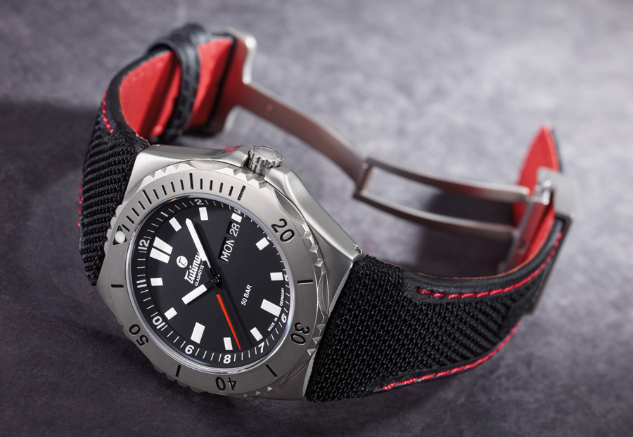 Цена модели Tutima M2 Seven Seas на титановом браслете с раскладной застежкой составляет 1890 евро, а на черном кевларовом ремешке с красной прошивкой - 1670 евро.