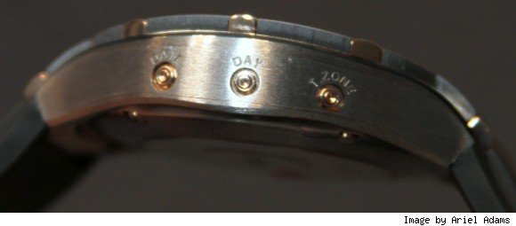 Корпус титановый с вставками из 18-каратного розового золота, диаметром 45 мм. На левой стороне корпуса размещены три кнопки для установки и корректировки вечного календаря; заводная головка - на 3 часах. Циферблат черный, с золотыми стрелками и часовыми маркерами с люминесцентным покрытием. Индикация часов и минут осуществляется центральными стрелками; секунд - на боковом циферблате на 4 часах; даты и дня недели - ретроградными указателями на 3 и 9 часах соответственно; месяца, високосного года и фаз Луны - на 12 часах; второго часового пояса и запаса хода - на 8 часах. Имеет браслет из титана с золотыми вставками, интегрированный в корпус. Вложение 99180 Вложение 99181 Источник: http://www.luxist.com/2011/01/30/pia...alendar-watch/ |