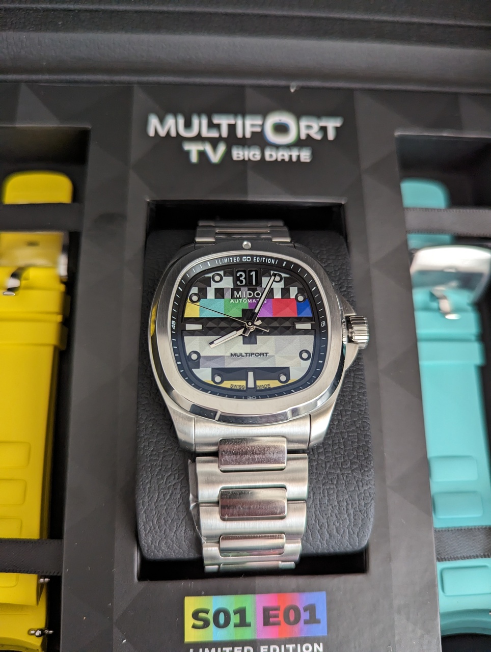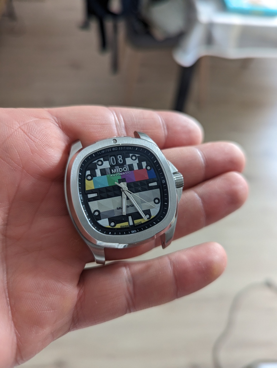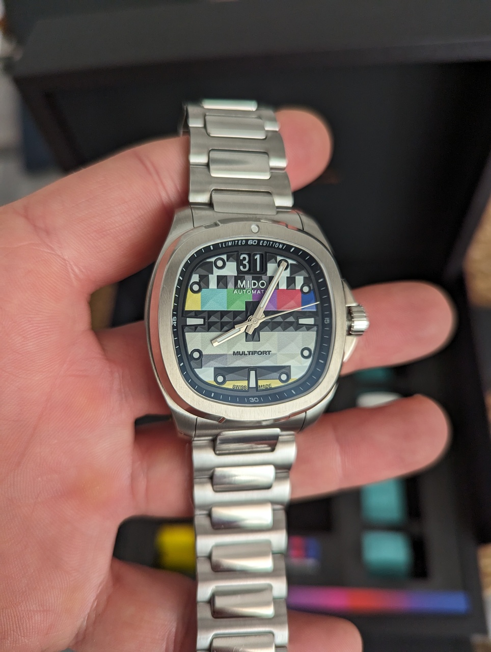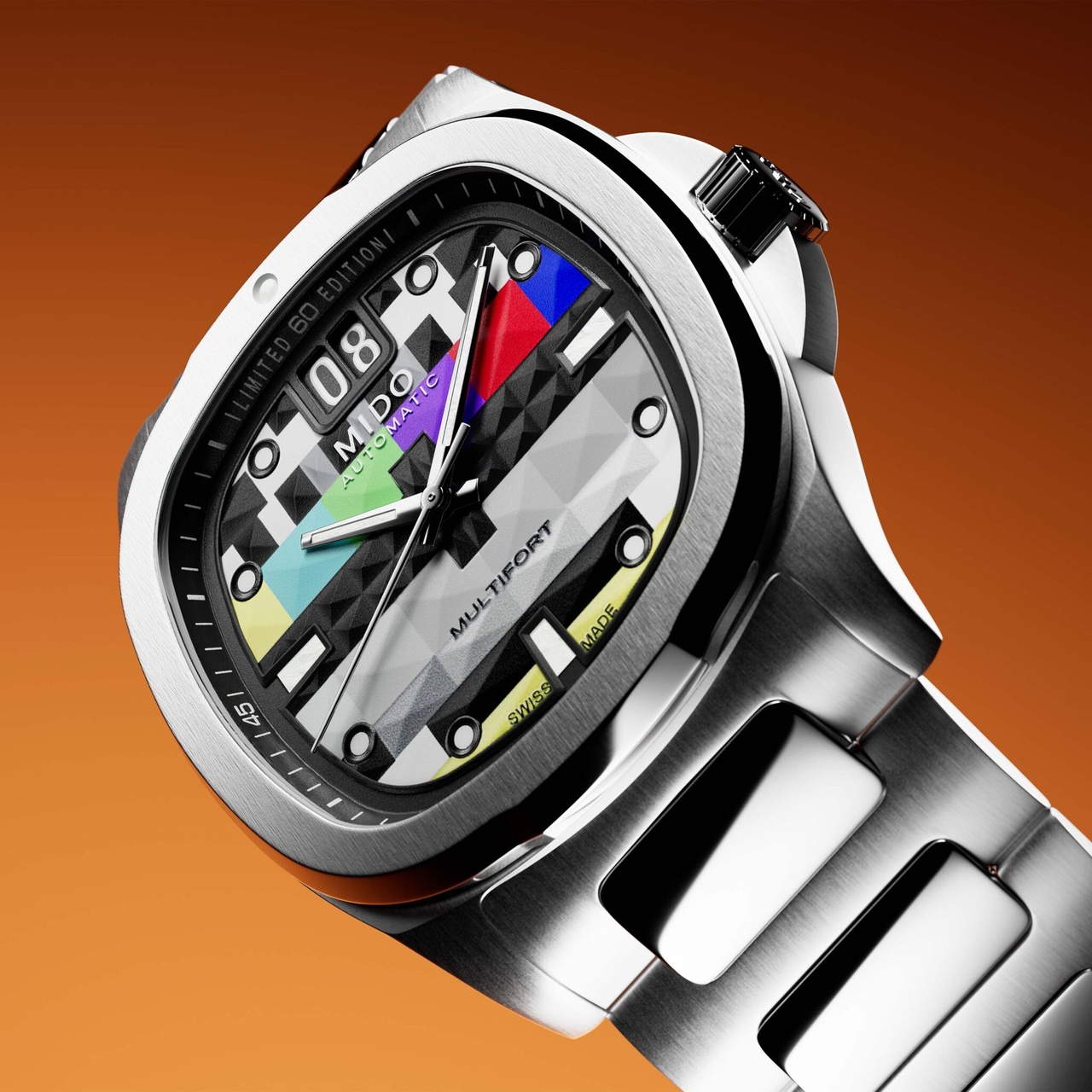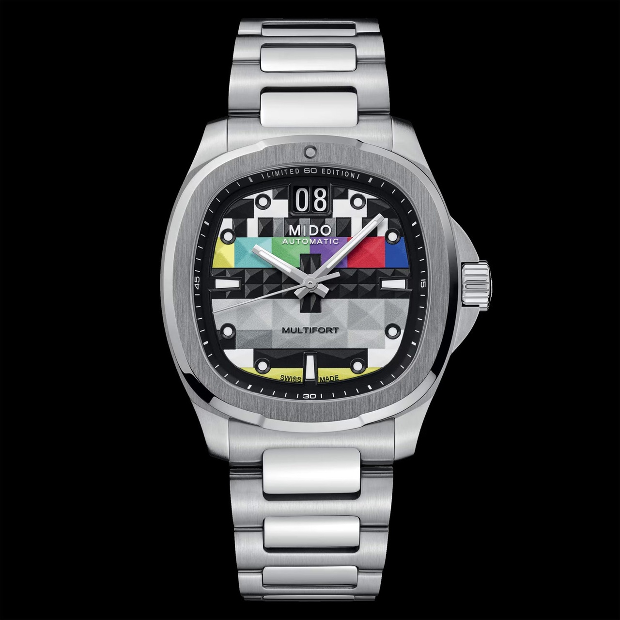 На днях Mido выпустил в продажу интересные часы для ценителей винтажной эстетики Multifort TB Big Date S01E01. Тема часов - аналоговое телевидение, поэтому на циферблате изображена "профилактика каналов".