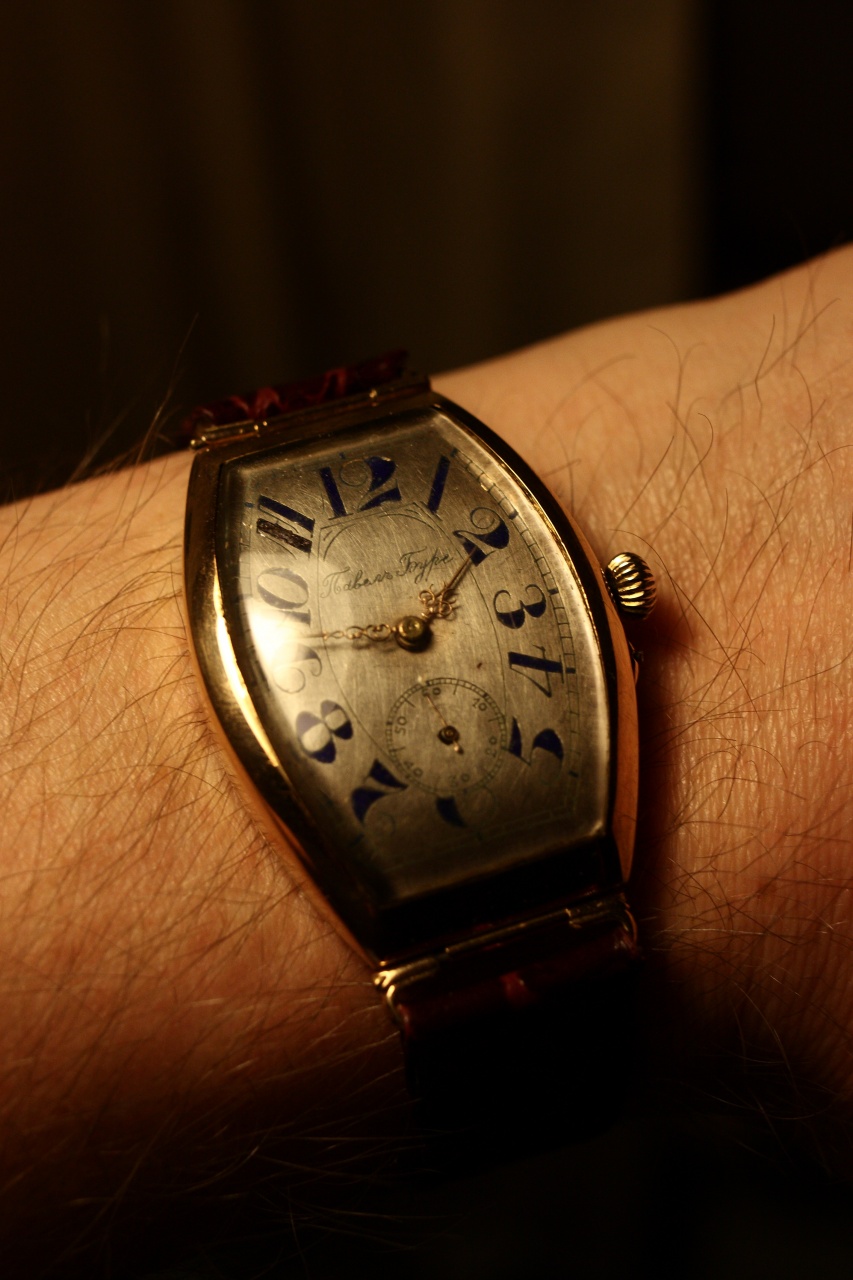 Увеличенное фото клейм: проба 583, именник мастера в квадрате ВИ, и рядом какая-то морда. Сбоку нацарапано похоже что 816 24, на механизме цифр нет. Цифербалат серебряный; цифры, шкала и надпись синие.