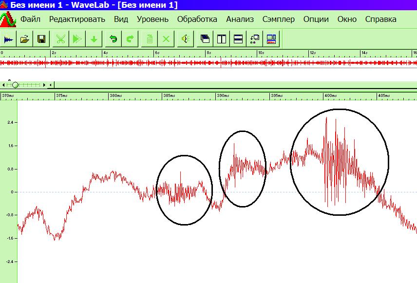 На скринах видно в чем суть- "тик" состоит из трех выраженных частей, нужно взять один из всплесков за опорный, легче всего край самого сильного всплеска, и выставить отсчет с этого края. Затем найти следующие два удара и посмотреть равный ли промежуток.
