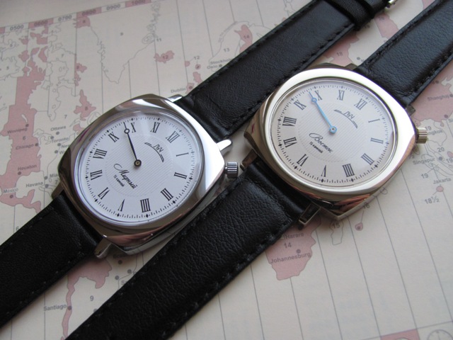 Корпус латунь. На "Востоке" покрытие нитрид циркония, на "Мирном" - хром. Каждого экземпляра выпущено всего по 18 штук.