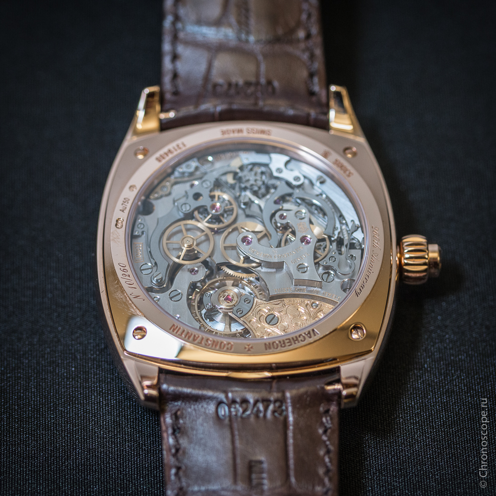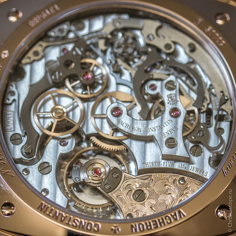 С тыльной стороны открывается завораживающая картина: сложнейшая колесная система, по периметру которой описывает окружность золотой инерционный груз, украшенный гравировкой. Обратите внимание, что колонные колеса хронографа декорированы мальтийскими крестами. А на корпусе и одном из мостов механизма (Caliber 3500) поставлены женевские клейма, свидетельствующие о высочайшем качестве отделки часов.