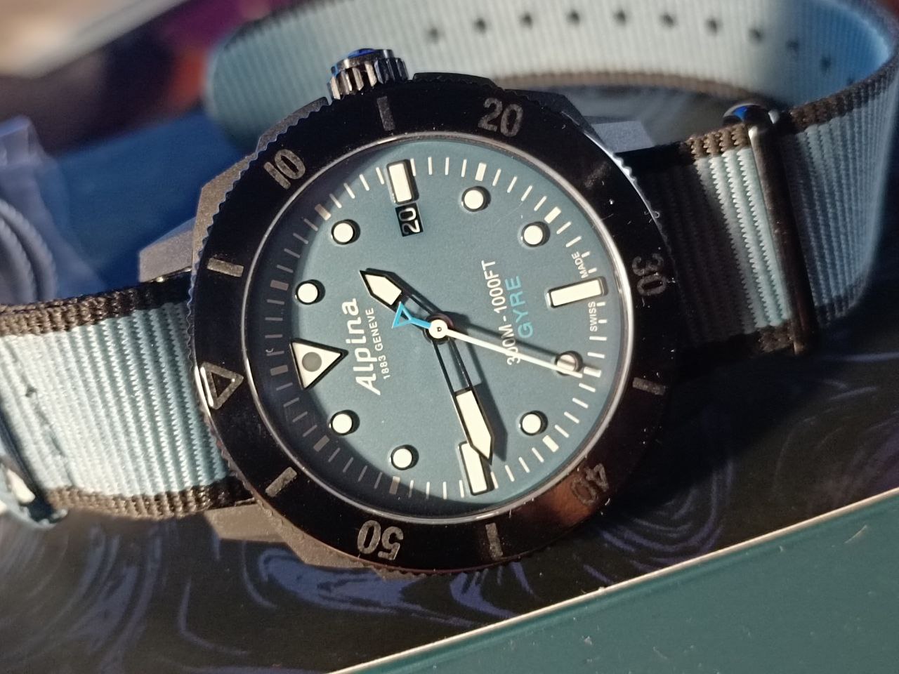 Дайвер от ALPINA//Seastrong Diver Gyre Gents Automatic//циферблат синяя дымка//на НАТОвском ремне//цена значительно снижена из-за поломки петель коробки//для себя//не для подарка//
