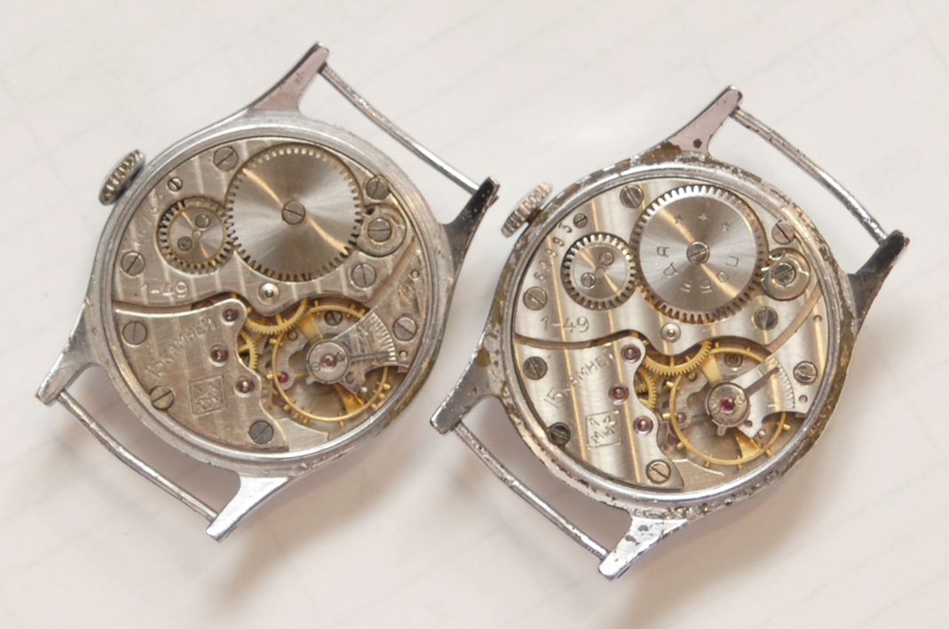 Отдельное направление моей коллекции - ранние Победы: по заводам, по годам, по кварталам. Меня интересуют изменения в механизмах, различные обработки механизмов в тот самый период, когда производство только налаживалось и оттачивалось. Встречаются различные обработки у механизмов одного квартала и года (фото 1), это вполне понятно - переходный период. Но удивляют неожиданные обработки (фото 2, 3 - это один и тот же механизм): известно, что "лысые" механизмы - признак 1947 года, но вдруг в середине 1949 года встречаем аналогичную обработку. К тому же механизм без номера. Этот механизм найден мной в куче хлама. Что это? Может это дипломная работа выпускника часового учебного заведения или это некондиция, вынесенная с завода и собранная дома на кухне? В 1949 году часы Победа были весьма дороги (месячная зарплата) и такое действие вполне имело смысл.