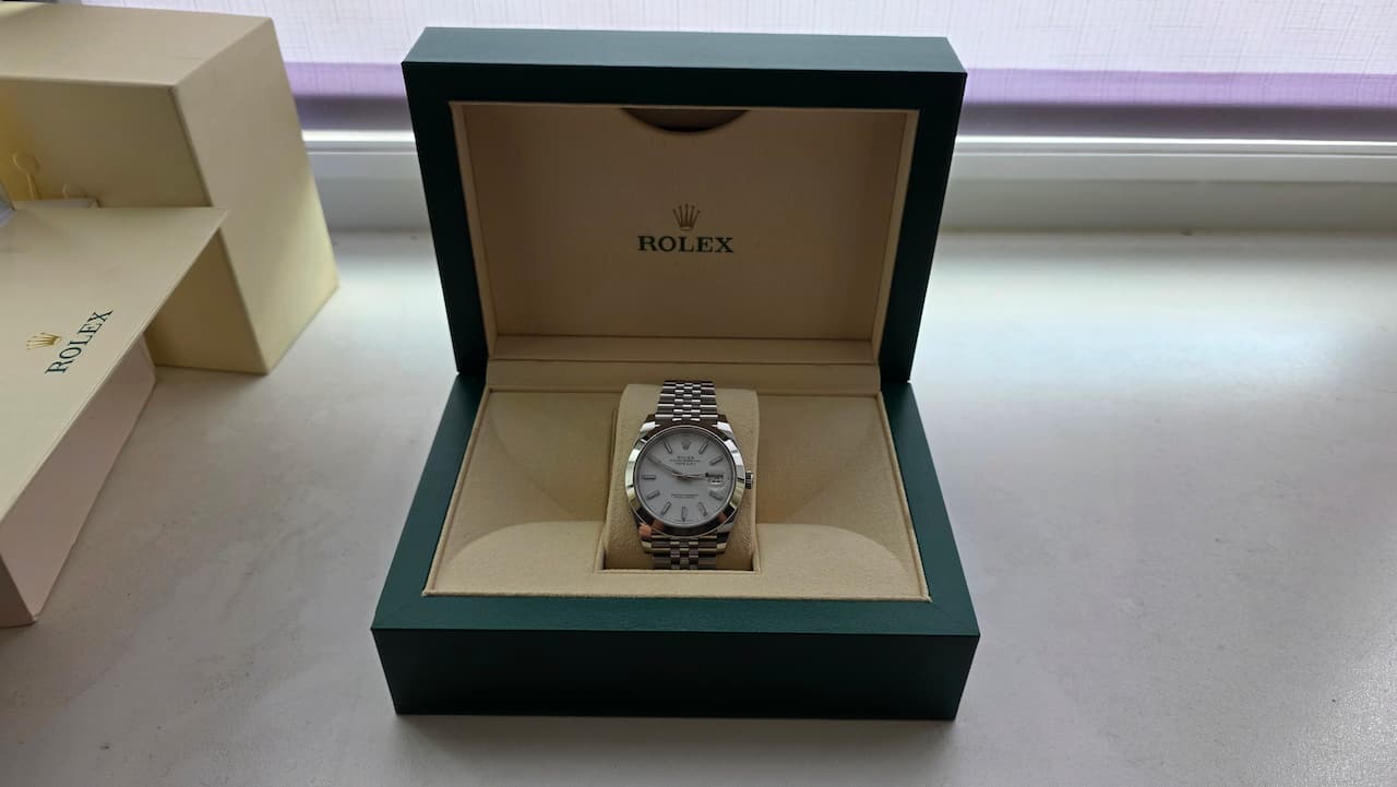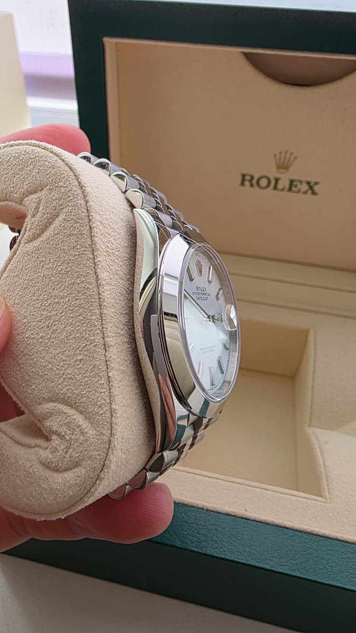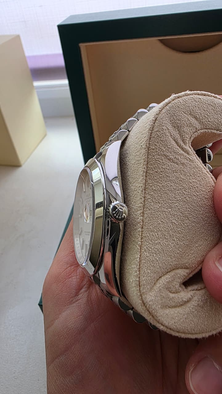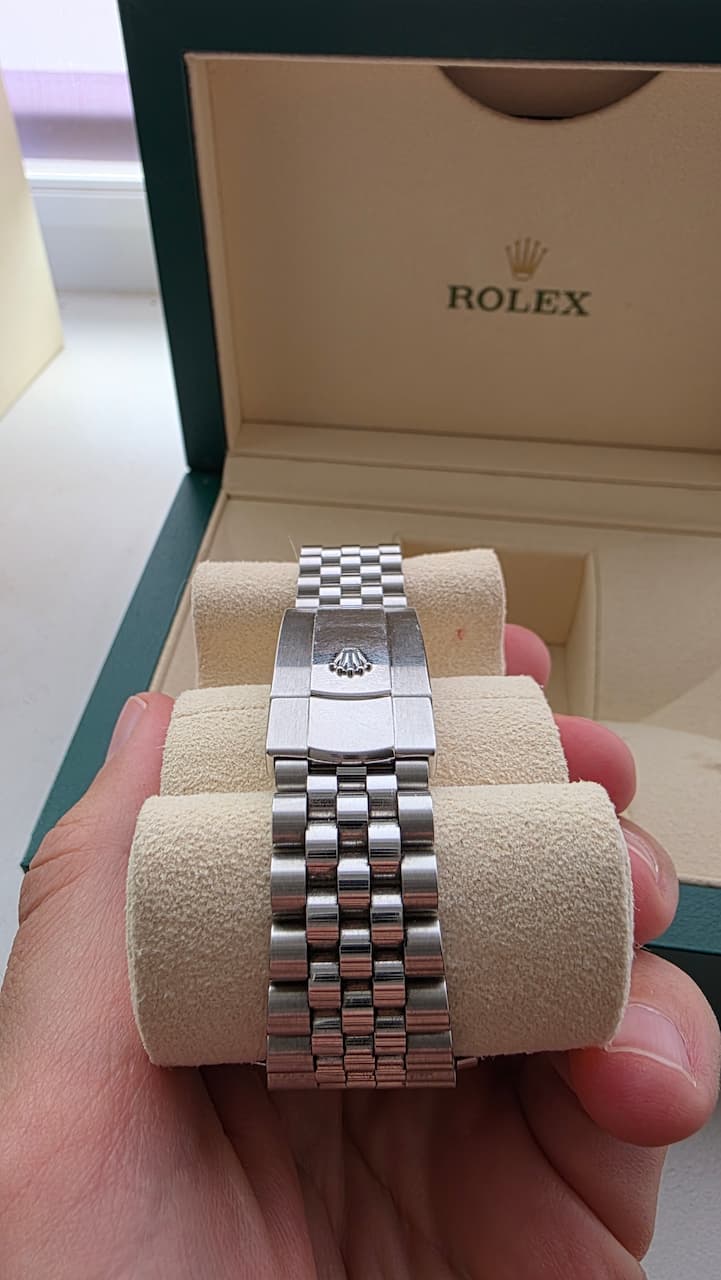 Продаю свой Ролекс Дейтджаст на юбилее, белый гладкий. Покупал в Чехии в 2019 году. Носил с 2019 по 2021 примерно через день. С 2021 лежал без дела. Не вскрывались.