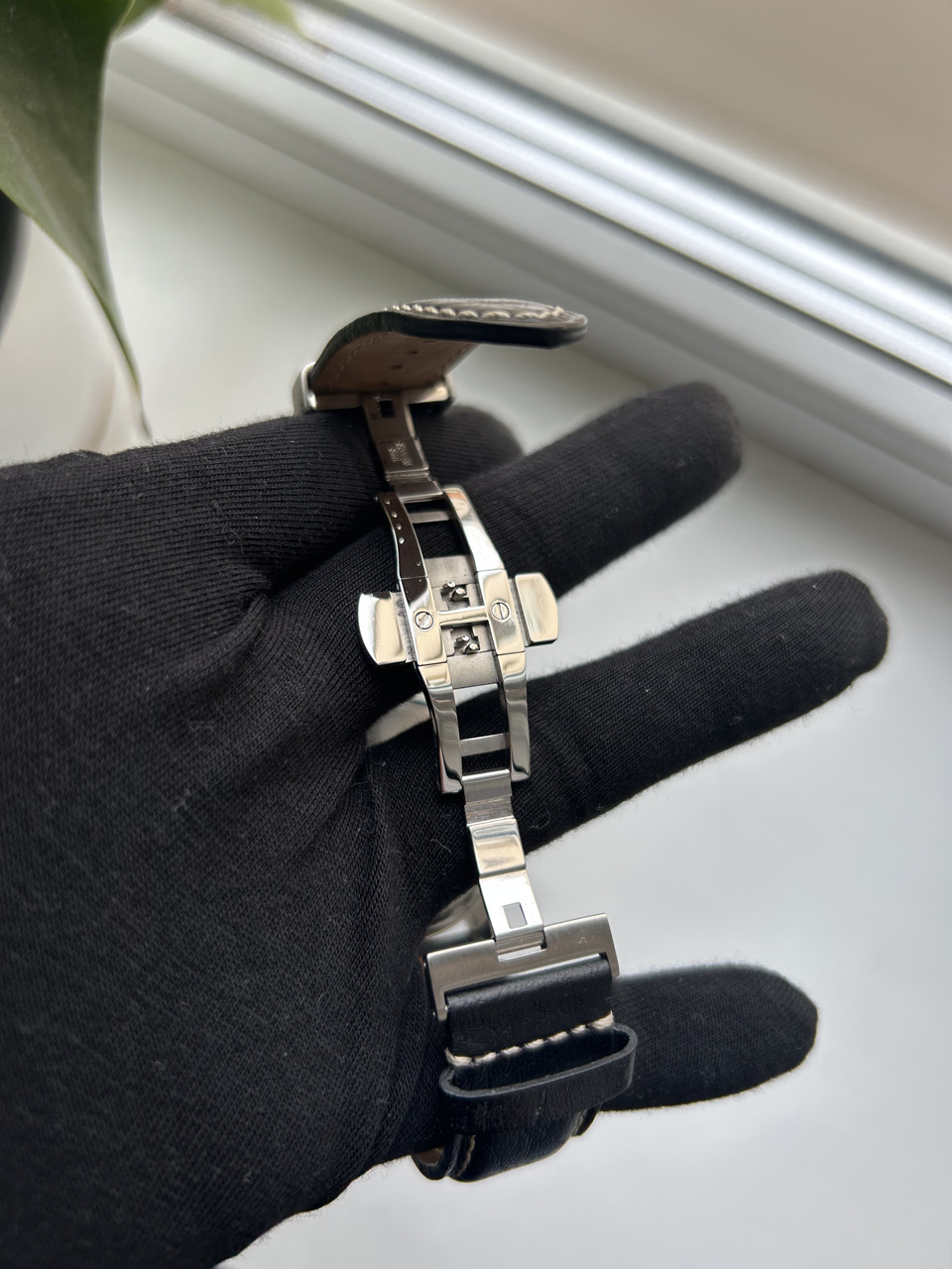 Классный родной черный кожаный ремешок с клепками и клипсой раскрытия.