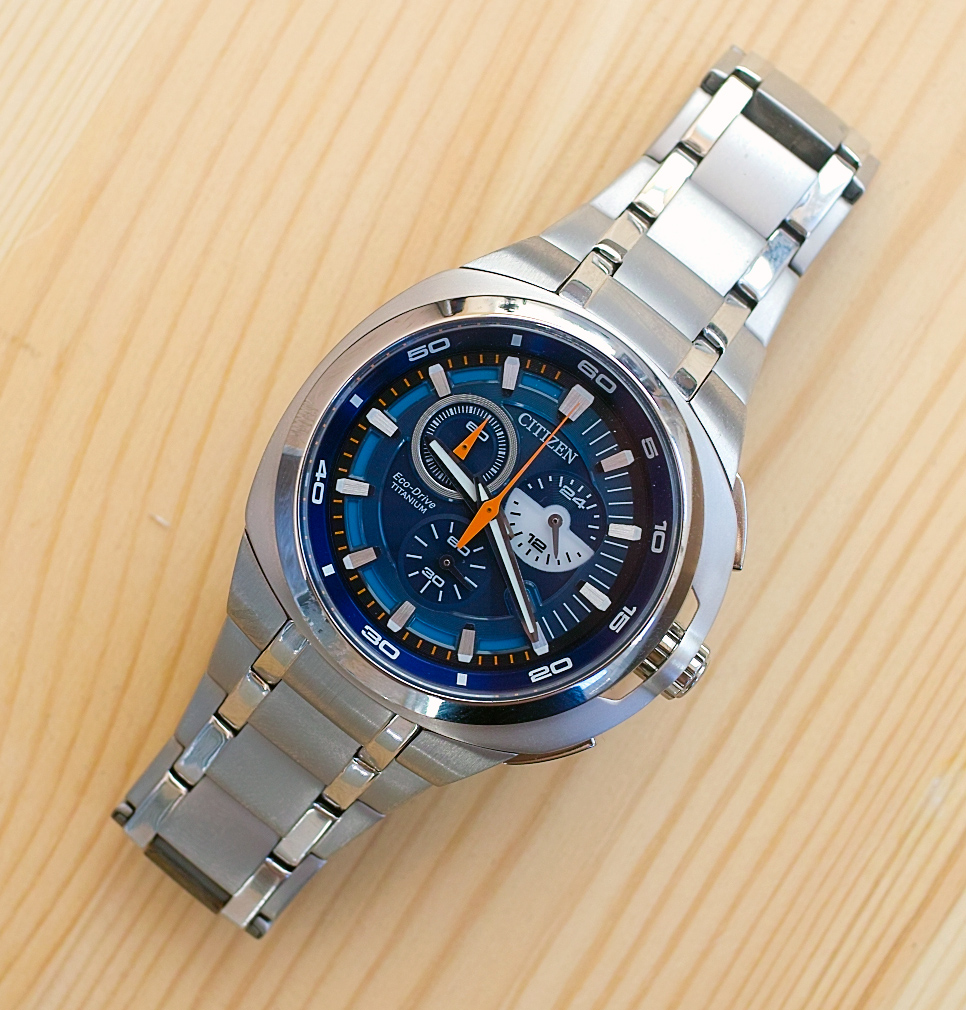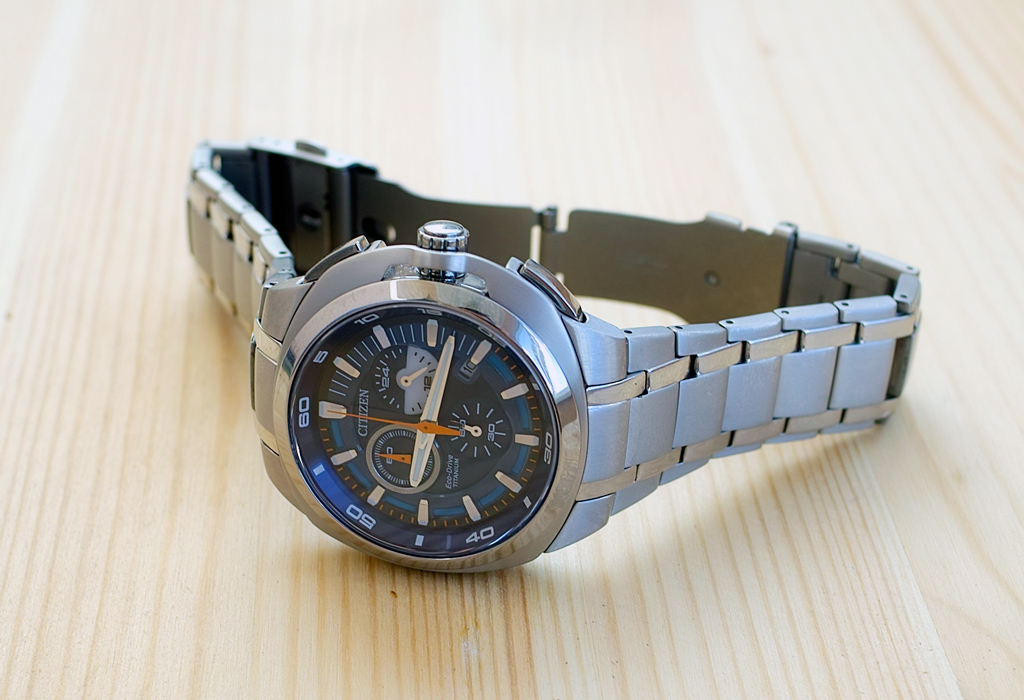 Что же я получил? Эко-драйв, титан, сапфир, 100м, достаточно яркий люминофор, очень хорошее качество сборки и отделки, понравившийся дизайн и потрясающий цвет! Часами очень доволен, но об их эксплуатационных качествах пака говорить рано. Из замеченных недостатков отмечу неточно встающую на деления центральную секундную стрелку хронографа.