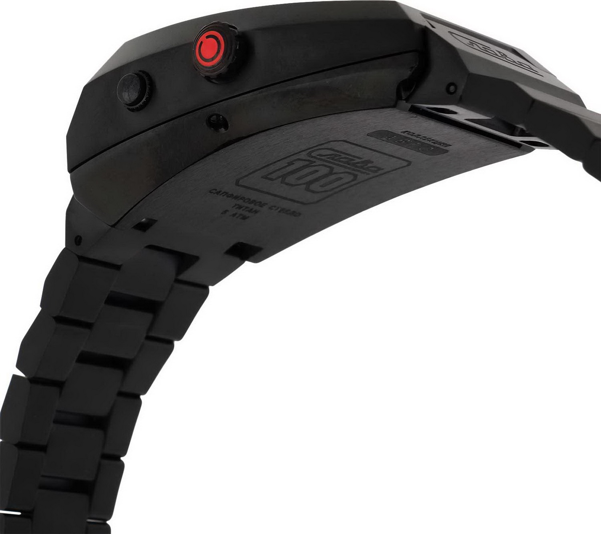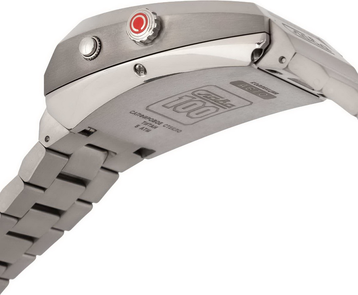 Браслет, как и корпус, из титана. Выполнен в стиле "для электронных часов". Застежка, раскладывающаяся в две стороны, металлическая.