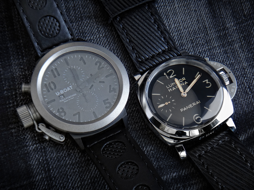 Фотография под названием "Большие, итальянские, подводные": сравнительное фото 50мм U-boat с 47мм Panerai 422. Выглядят как часы одинакового размера, у Panerai еще и ремень на 3мм шире: