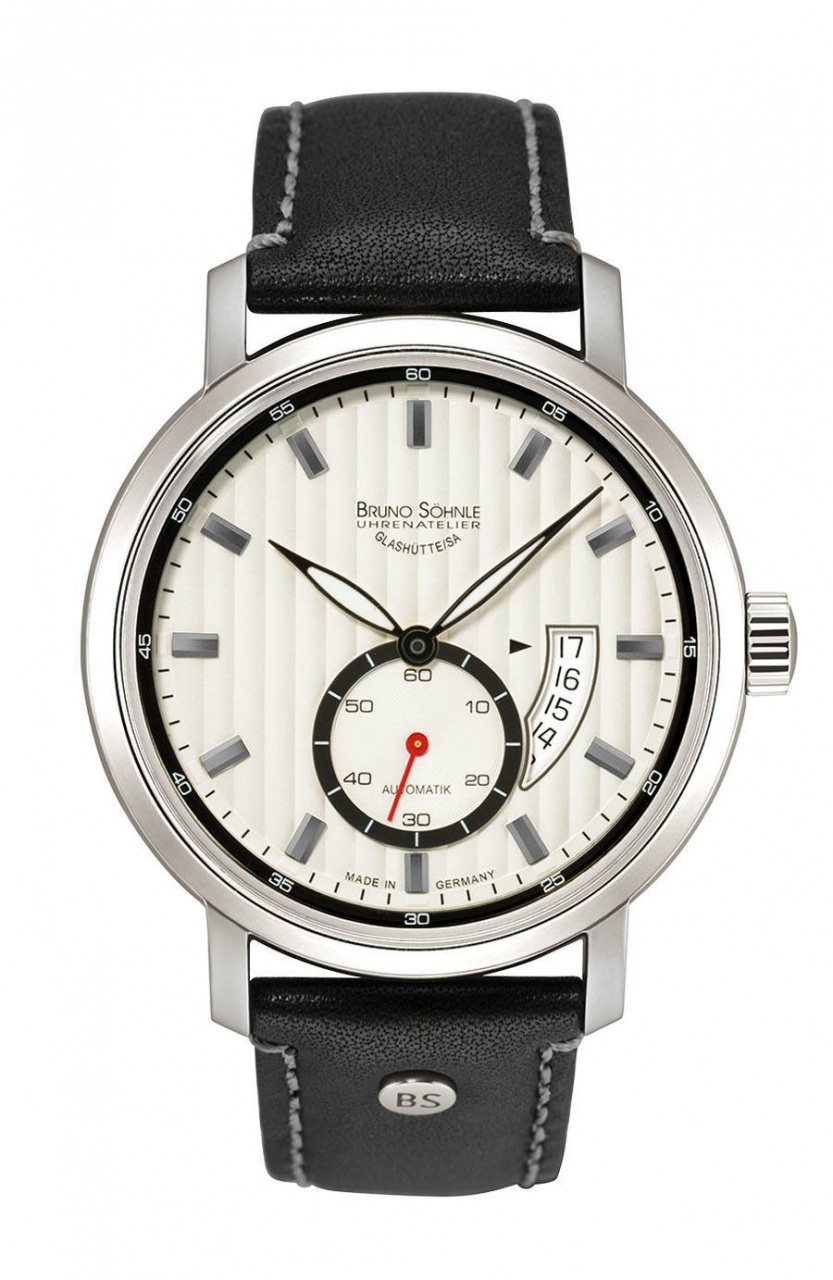 Круглый полированный корпус новинки, изготовленный из нержавеющей стали, диаметром 44,0 мм. На торце завинчивающейся рифленой заводной головки, расположенной на 3 часах, выгравирован логотип бренда Bruno Söhnle. Сапфировое стекло установлено на передней стороне часового корпуса и на его завинчивающейся задней крышке. Белый циферблат, отделанный вертикально расположенными "женевскими полосками", с накладными гранеными часовыми маркерами, часовой и минутной стрелками, черного цвета. Последние выполнены в листьевидной форма и покрыты, как и часовые индексы, расположенные на периферии циферблата, люминесцентным составом белого цвета. Секундная стрелка - красного цвета.