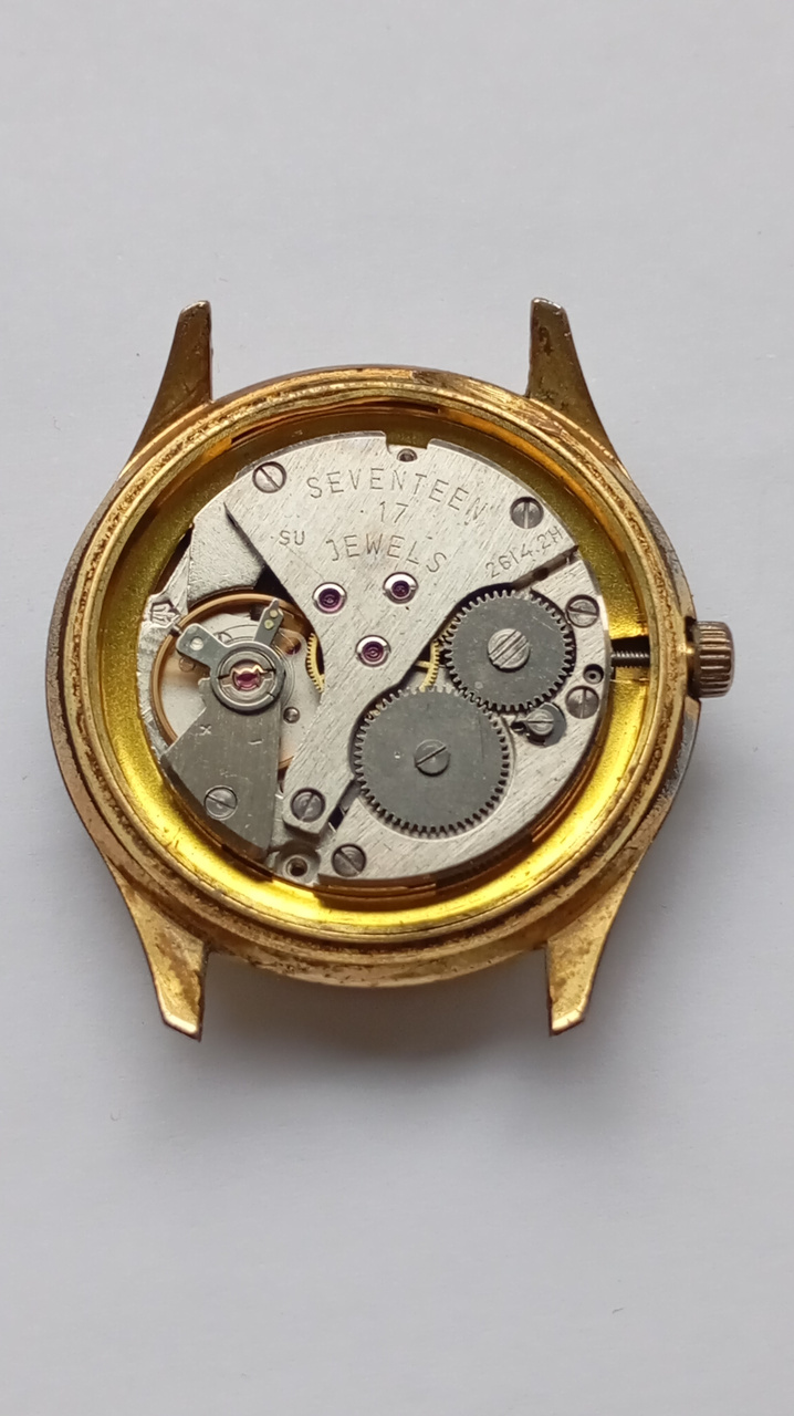 На задней крышке было выбито CAL 2614 (см. фото 2). Вскрытие показало, что внутри хорошо сохранившийся советский механизм Poljet 2614.2H (см. фото 3). Циферблат с какой-то текстурой - по внешнему виду перламутровый, но без цветных оттенков. Часы идут очень тихо - слышны только в тихой комнате, приложив крепко к уху.