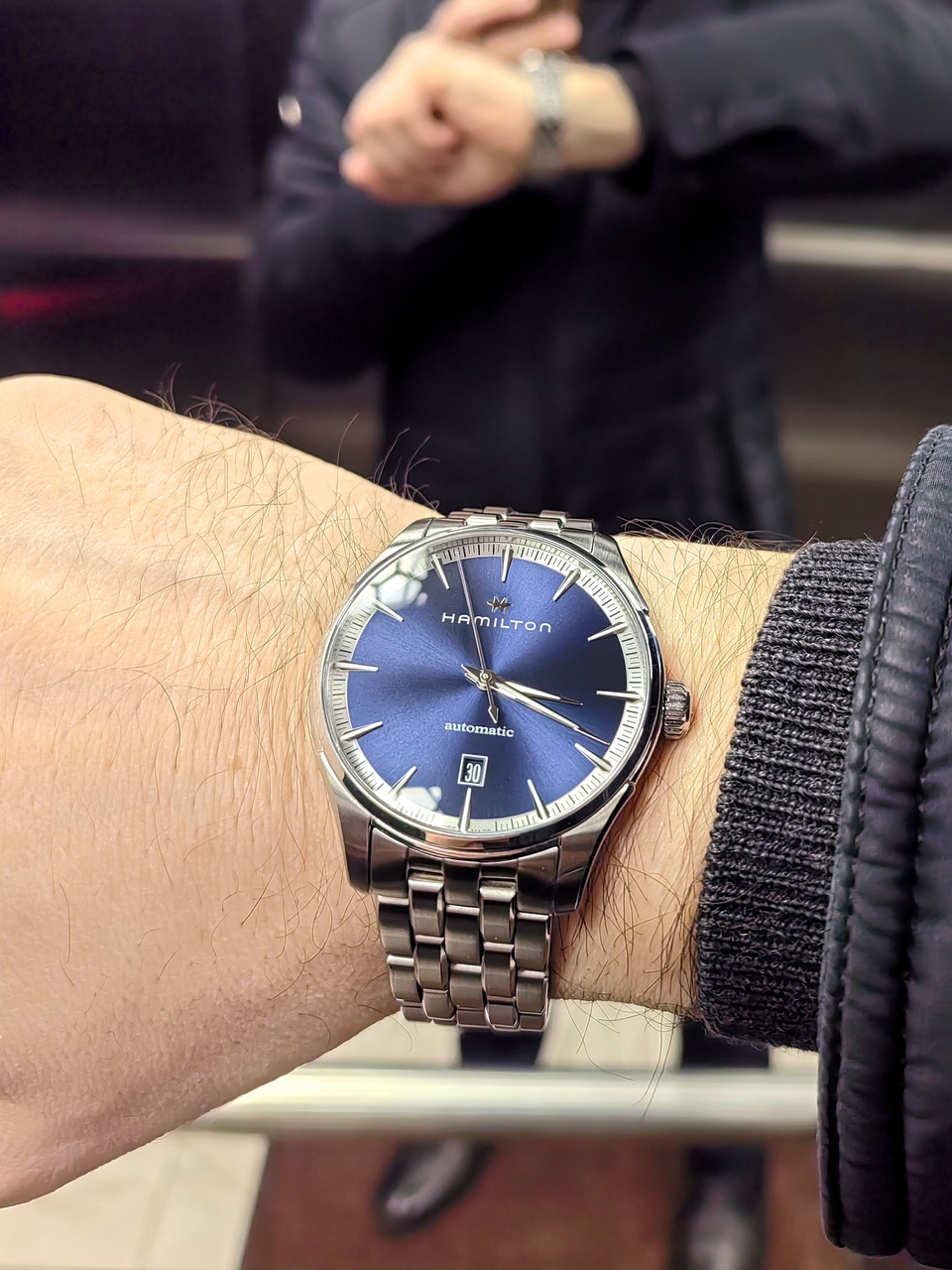 Покупка эта была довольно спонтанной. Марка Hamilton до последнего времени меня особо не привлекала. Филды и авиационная тематика на меня впечатления не производят, дайверские хэмы тоже не впечатляют, ничем не лучше аналогов японского производства и других швейцарских марок. Но совсем недавно захотелось чего-то строгого, делового, костюмного и не предназначенного для других целей. Требования были просты: сталь, три стрелки + дата, сапфир, браслет. Выбирал не долго, ровно до тех пор пока не попался мне в подборке джазмастер. Ранее я совершенно спокойно проходил мимо него, а тут взглянул на него совершенно по новому, зацепил меня вариант "автомата" с синим цифером на браслете. Начал его изучать, разглядывать, и он мне стал нравится всё больше и больше. И тут именно такой вариант подвернулся на маркете. Звезды сошлись, так сказать!