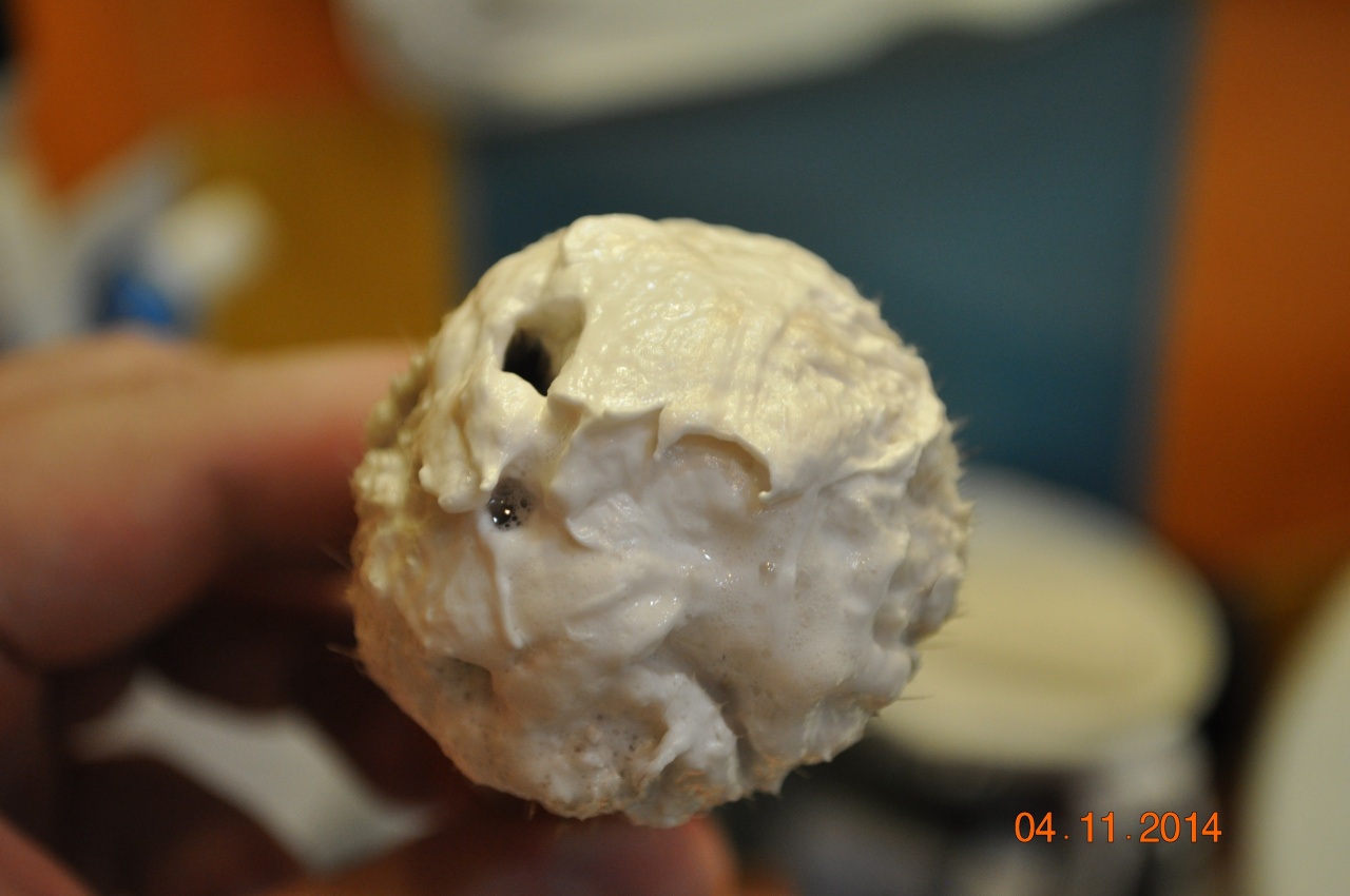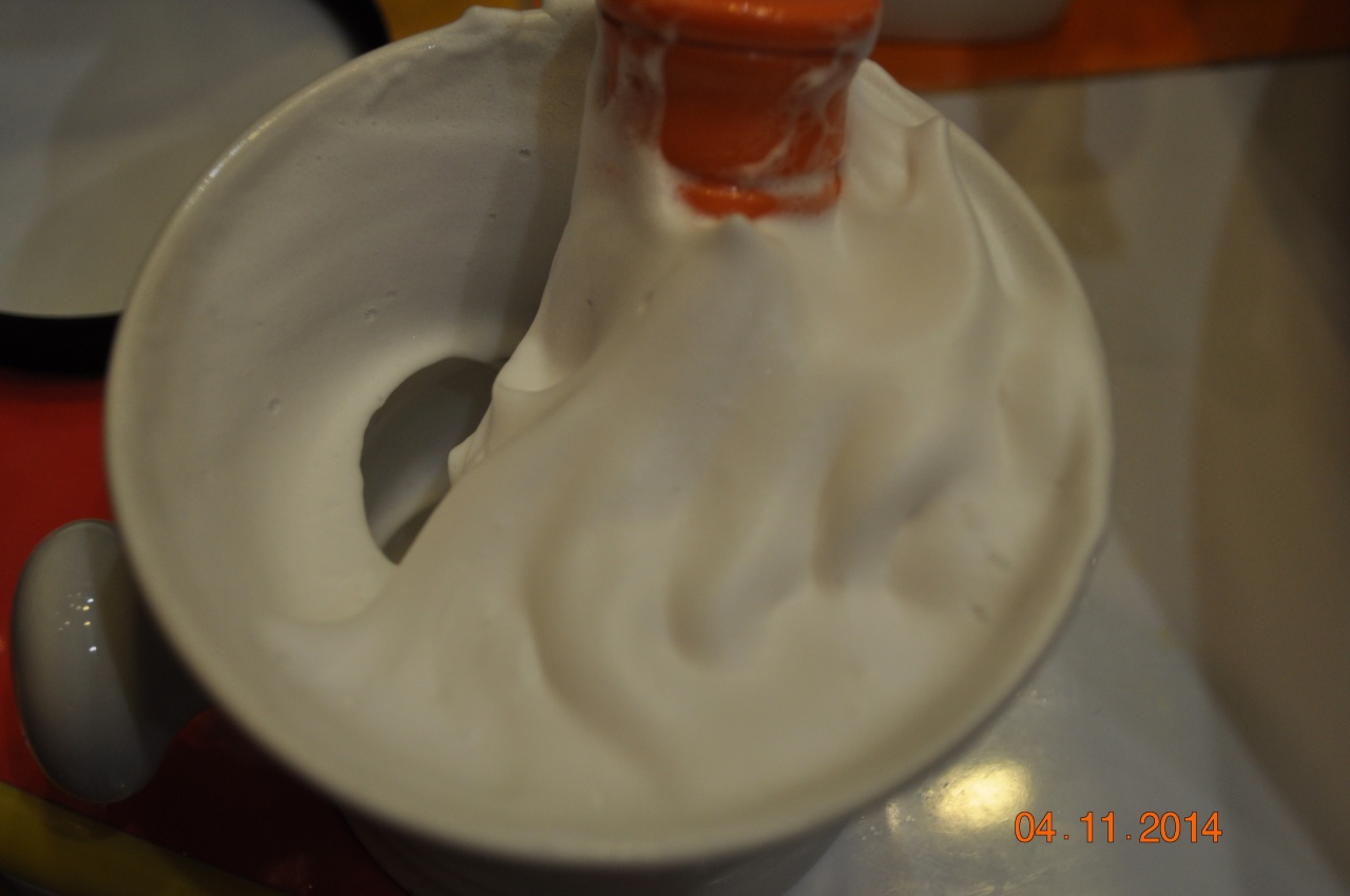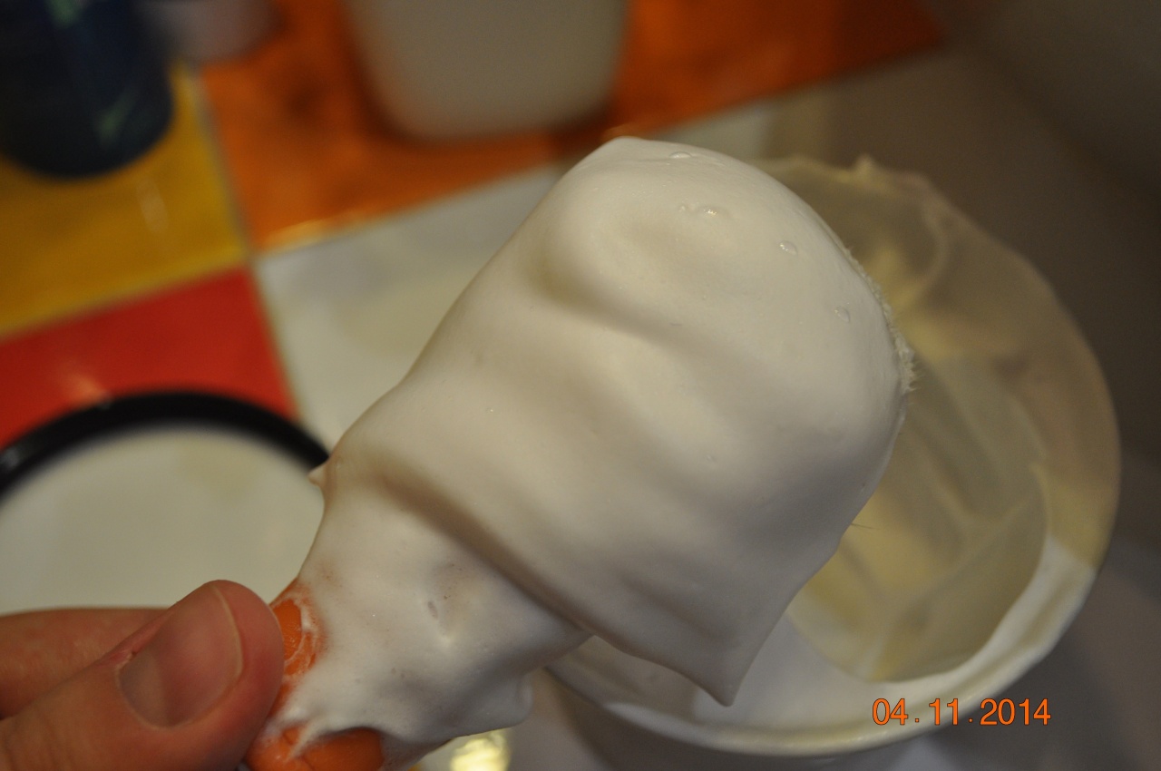 Пена получилась практически идеальной, густой, с очень стабильной структурой. Кстати, мне кажется, что экспериментируя с количеством воды можно "играть" с пеной, добиваясь "сливочнообразной" структуры (то есть более легкой) или "творожной" (тяжелой и более плотной) структуры на выбор. В ближайшие дни проверю свою теорию.