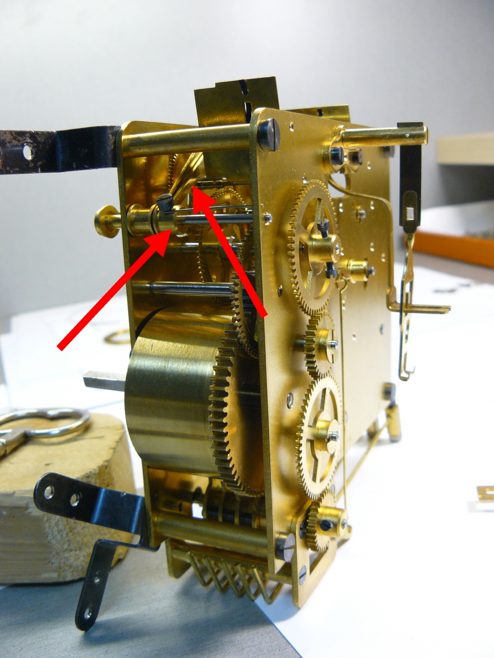 при этом большой рычаг остается приподнятым благодаря счетному колесу (chime locking plate), бой происходит до тех пор, пока большой рычаг не упадет в паз на счетном колесе и детент не заблокирует штифт колеса четверти