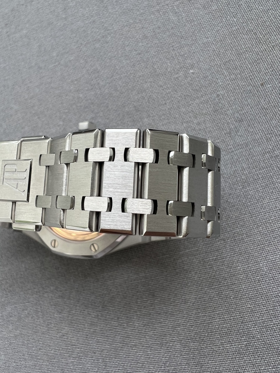 Циферблат аспидного цвета с узором «Grande Tapisserie», накладные часовые метки и стрелки Royal Oak из белого золота с осажденным люминесцентным покрытием.