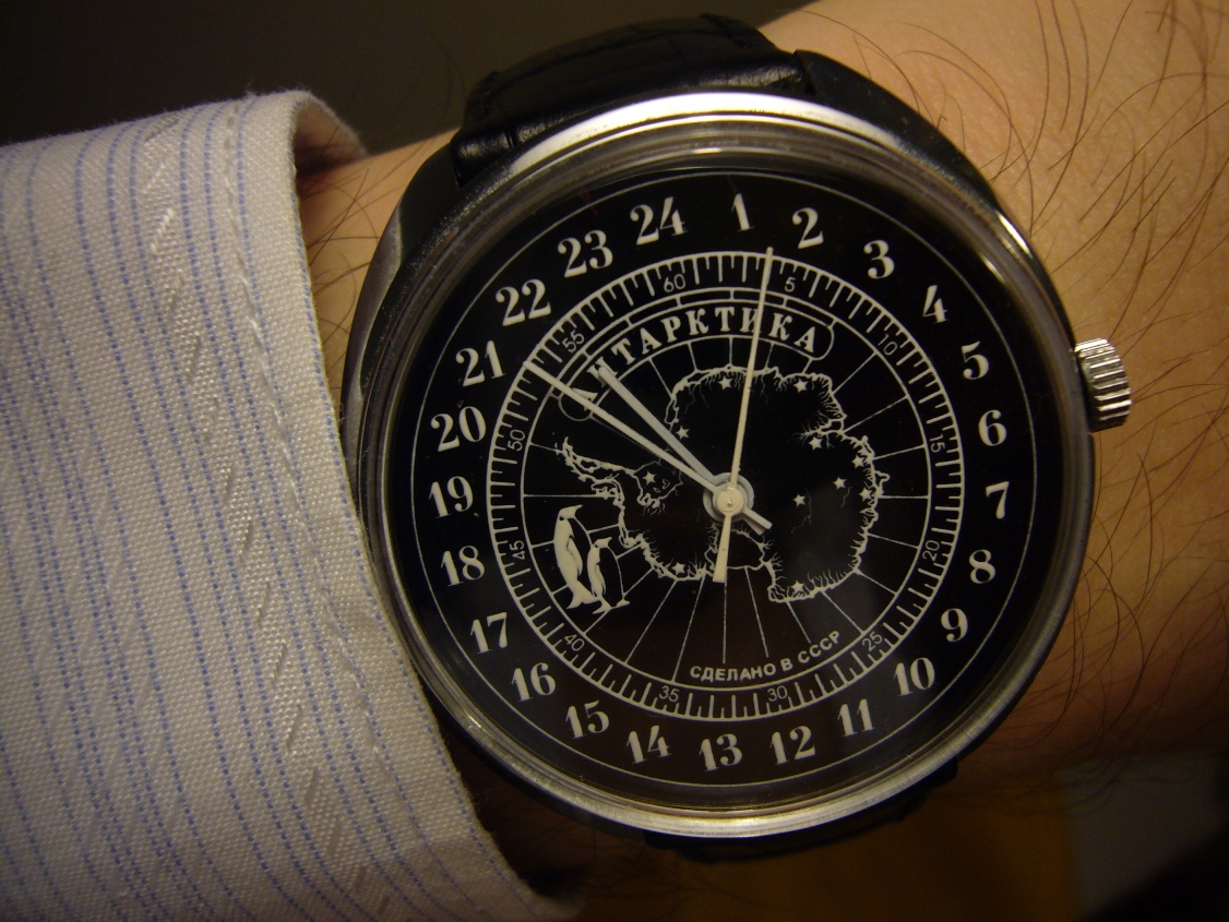 У меня есть одни подобные 24-х часовые - РАКЕТА АНТАРКТИКА с силуэтом Антаркиды по мотивам часов "Советская Антарктическая Экспедиция" (которые я в носибельном состоянии, к сожалению, не смог достать). Изредка под настроение ношу их и не комплексую - мне часики нравятся.