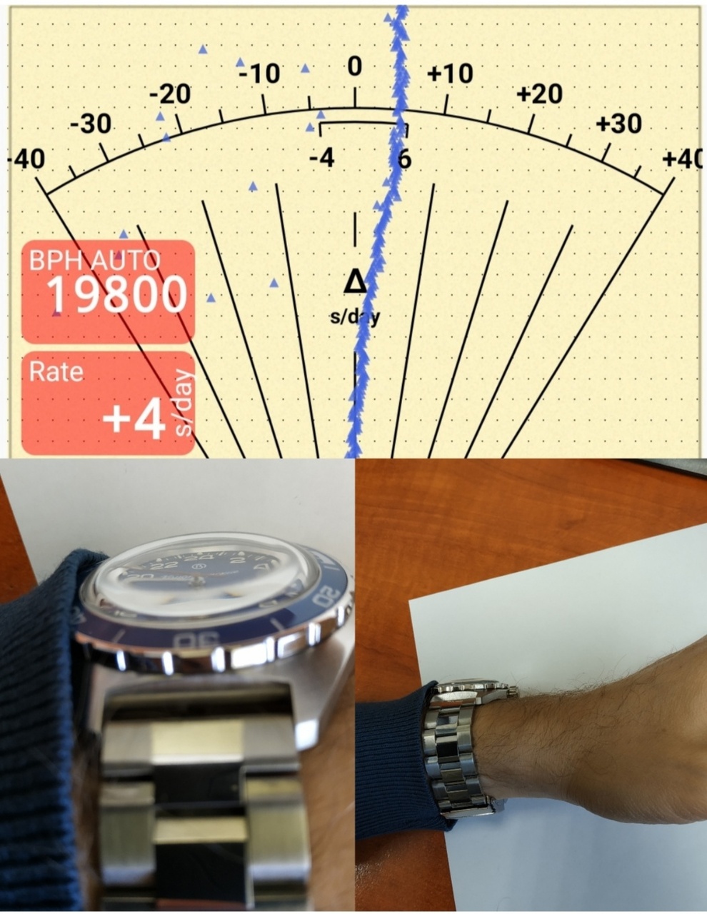 Замеры делал в приложении. Часы выставлял горизонтально циферблатом вверх и циферблатом вниз, на бок ЗГ вниз и на бок ЗГ вверх, вертикально дата внизу и вертикально дата вверху. Перед замером давал несколько минут устояться механизму после переворотов корпуса (между разными положениями). Обратил внимание, что механизм работает чуть-чуть быстрее или медленнее даже в зависимости от положения секундной стрелки на циферблате во время её движения, в приложении это видно по текущему показателю отклонения точности хода.