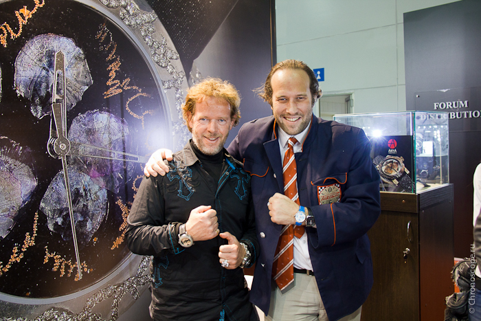 PS На вопрос знает ли Иван русских часовых мастеров, он ответил, что знаком с Сергеем Волковым. «Мастер из Углича, делает отличные циферблаты, да и вообще классный парень!» – сказал Арпа. После этого, при посредничестве корреспондентов журнала Chronoscope состоялось знакомство Ивана Арпы и Жака Полье, которого мы обнаружили на выставке. Не можем не поделиться редким кадром: