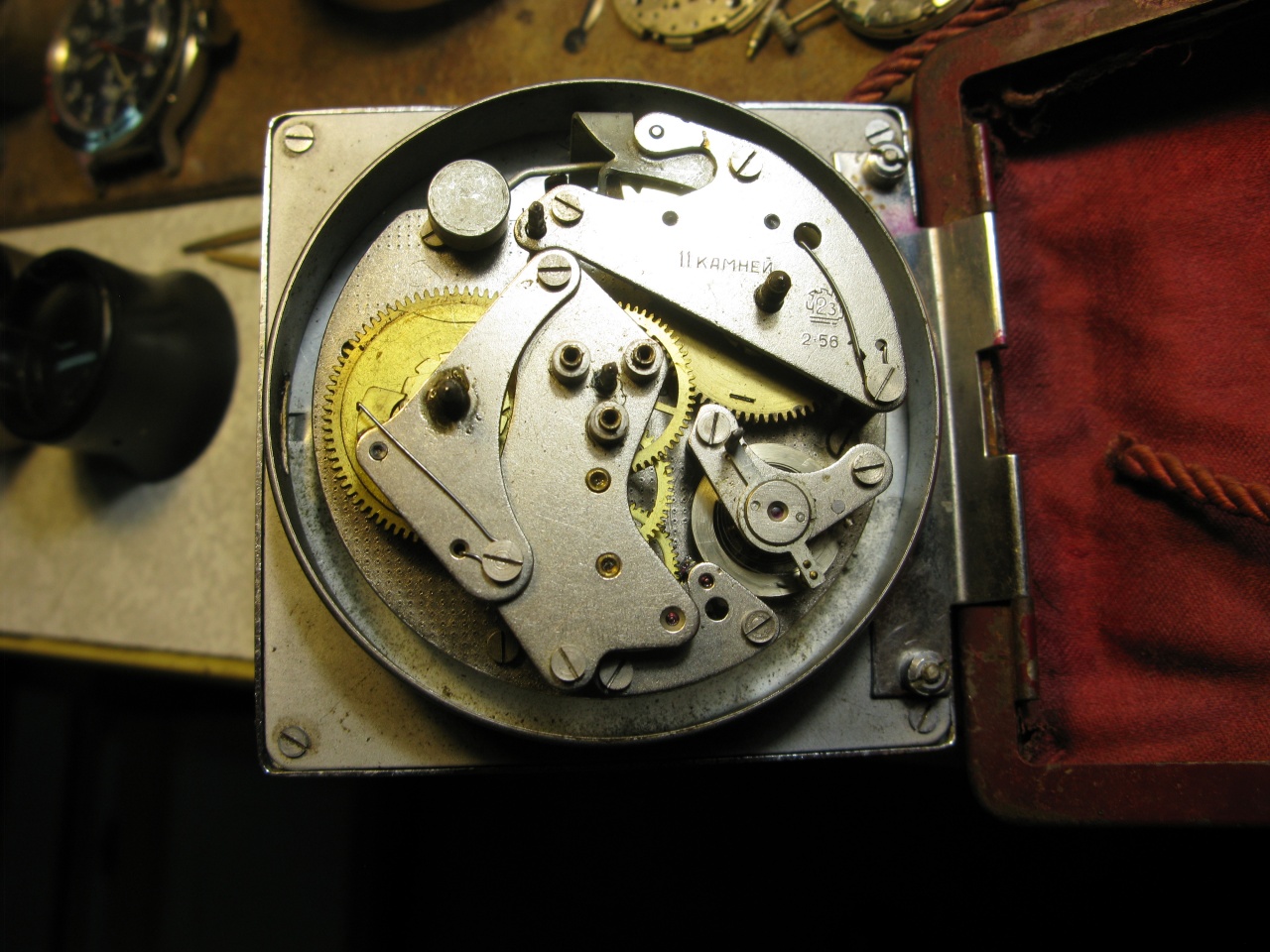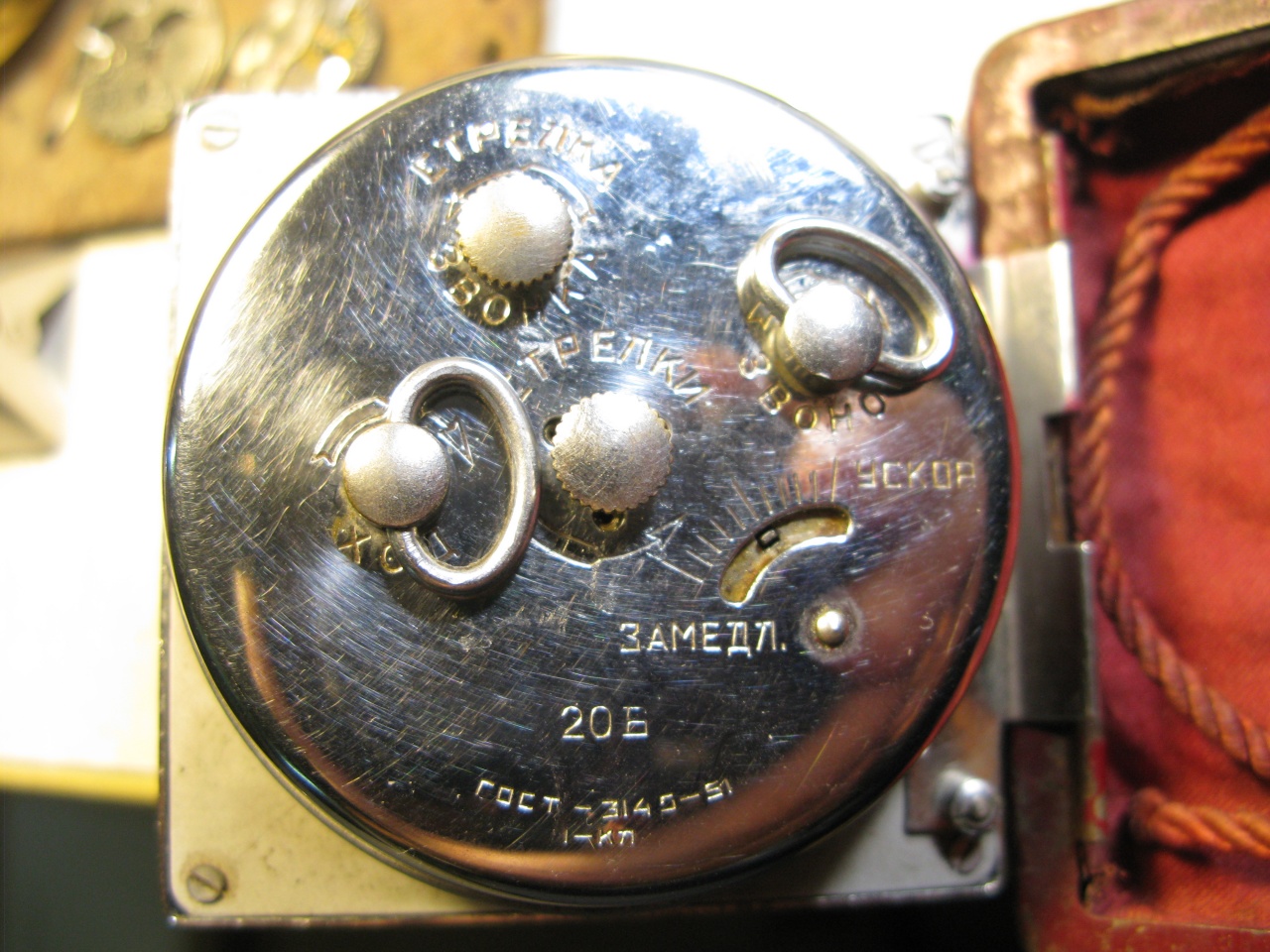 Аппарат поменял владельца и переехал на пмж ко мне. При разборке я его чуть не угробил. Начал спускать заведённую пружину хода и ни как не предполагал, что стойка собачки храповика немного вышла из своего гнезда, т.к. прослабло обжатие. Первые два оборота прошли без вопросов, а на третий отпущенная собачка легла не на зубья звёздочки, а мимо неё, и пружина со всей дури распустилась. Внутри всё похолодело, думаю всё- шандец колёсам ангренажа. Но пронесло, снял мостики, колёса оказались без повреждений. Потом пришлось стойку собачки раскернивать. Но чуть-чуть переборщил, собачку зажало, пришлось её раскачивать. В общем геморрой на ровном месте.