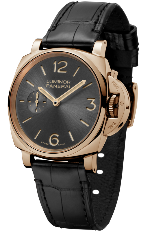 Толщина корпуса новых Luminor Due 3 Days составляет всего 10,5 мм, что делает эту модель самыми тонкими часами коллекции Luminor из когда-либо созданных. Они представлены в двух версиях: из нержавеющей стали AISI 316L и из красного золота. Классический минималистский циферблат Panerai с цифрами, часовыми метками в форме рисок и малой секундной стрелкой в положении «9 часов» покрывает сапфировое стекло. Циферблат – черный в варианте из нержавеющий стали и антрацитовый для версии из красного золота – имеет классическую сэндвичевую структуру с отделкой «солнечные лучи». Сквозь прозрачное стекло на обороте можно рассмотреть калибр P.1000 с ручным заводом. В модели с корпусом из красного золота этот калибр впервые представлен в изящной скелетонированной версии P.1000/10.