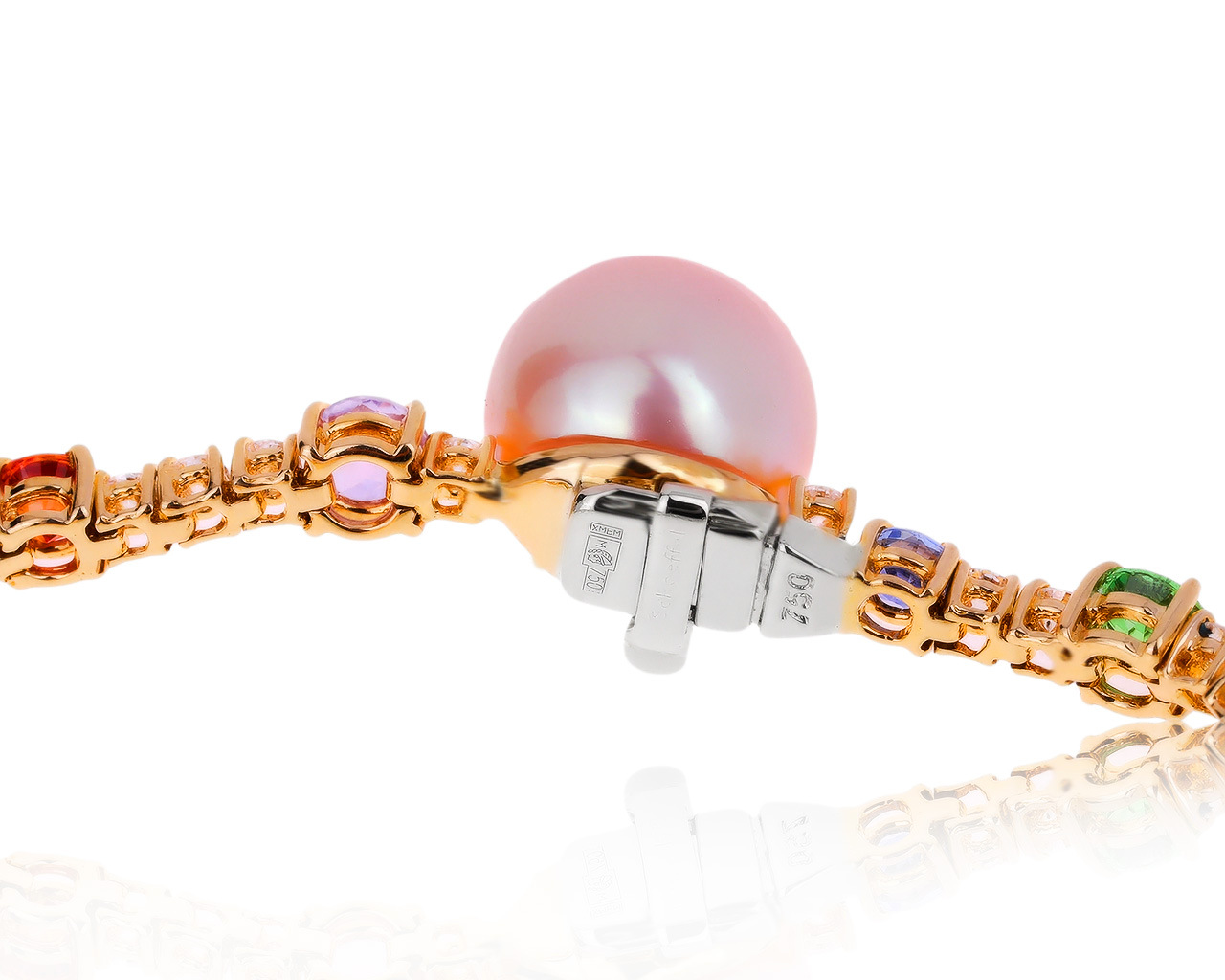 Представляем вашему вниманию оригинальный золотой браслет с жемчугом 10 мм, бриллиантами 1.33ct и голубыми 1.36ct и розовыми 0.76ct сапфирами от всемирно известного бренда Schoeffel.