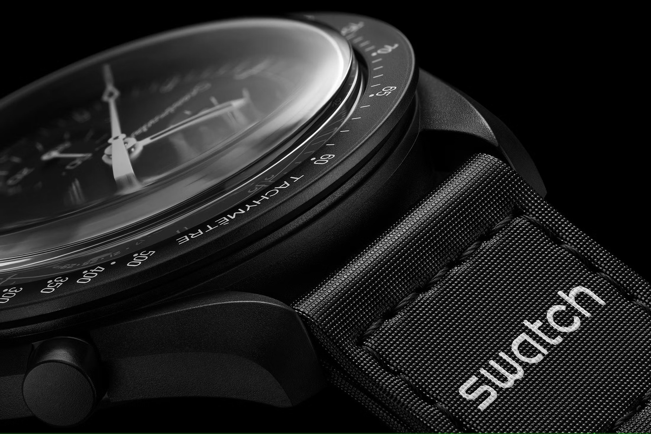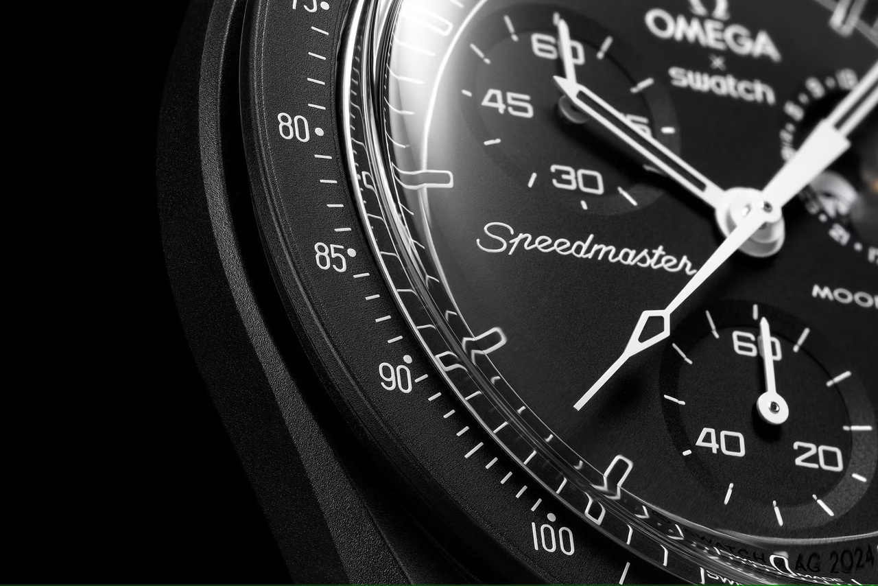 Циферблат украшен логотипом OMEGA X Swatch, культовым логотипом Speedmaster и новым логотипом MoonSwatch.