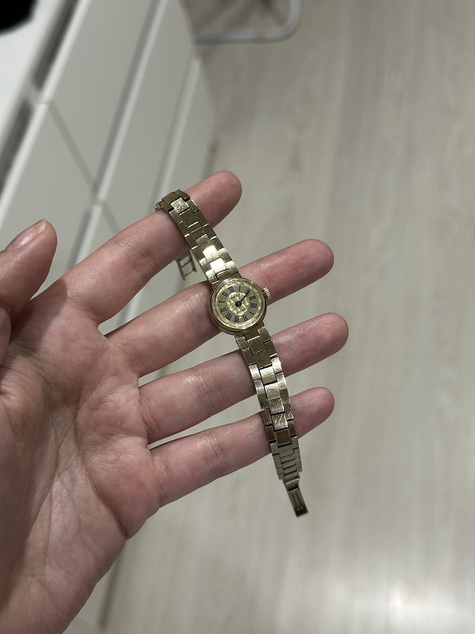 Механические женские часы угличского часового завода, механизм 1601А, корпус и браслет позолоченные (клеймо Au) или покрытые нитридом титана (клеймо T). Если сделаны уже в России, не в СССР, то могут быть и без клейма.