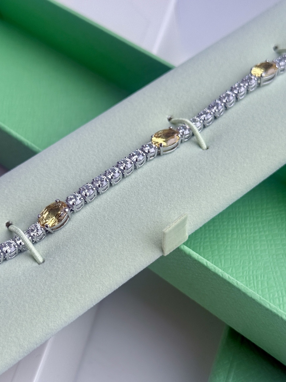 Браслет украшен белыми прозрачными камнями и желтыми кристаллами овальной огранки.